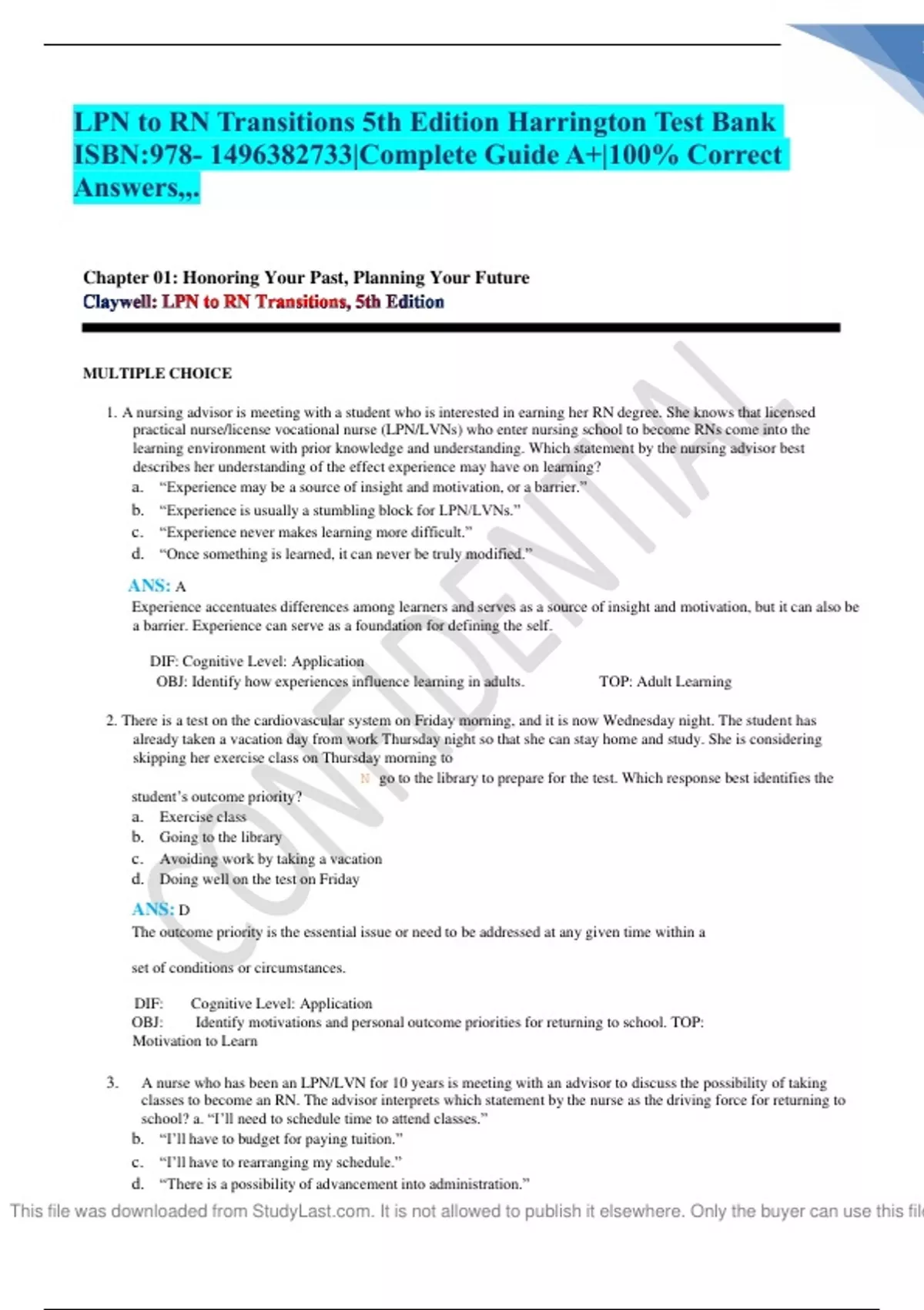 LPN to RN Transitions 5th Edition Harrington Test Bank ISBN:978- 1496382733|Complete Guide A+|100% Correct Answers,,. 2 Exam (elaborations) TEST BANK FOR LPN TO RN TRANSITIONS 4TH EDITION CLAYWELL |Complete Guide A+|100% Correct Answers.