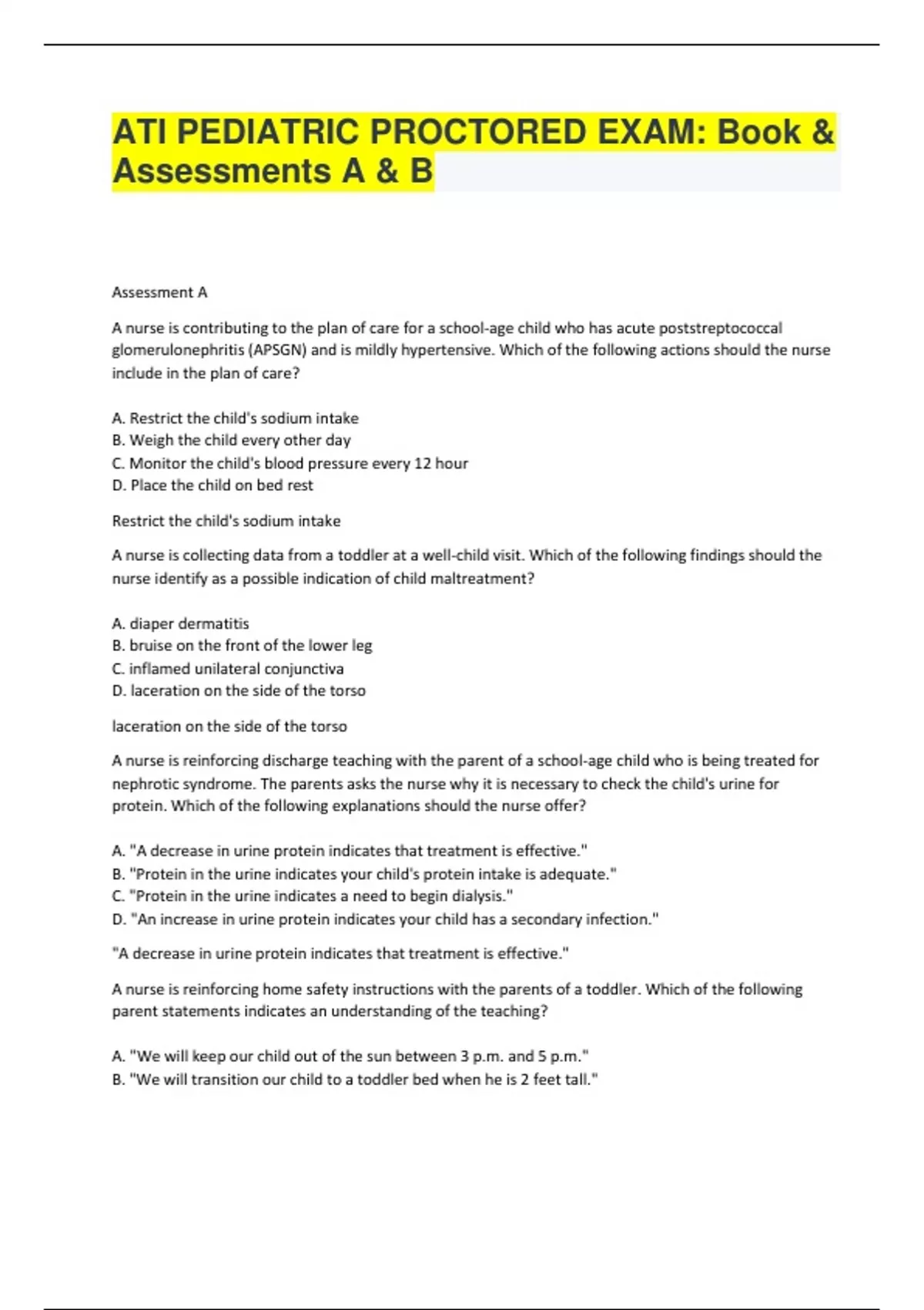 ATI proctored exam Pediatrics 100 % correct answers and question