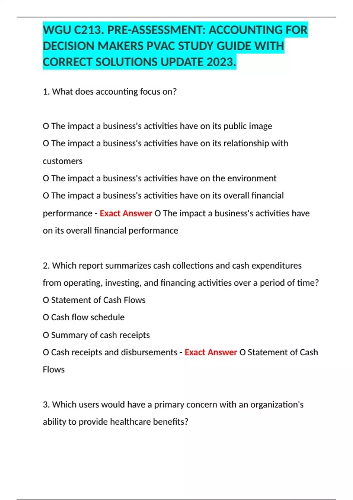 1 Exam (elaborations) C213 Accounting for Decision Makers-3 WGU Exam Questions & Answers with Correct Solutions 2023. 2 Exam (elaborations) WGU C213 Accounting for Decision Makers PVAC Exam Questions & Answers Best Rated A+ 3 Exam (elaborations) C213 Accounting for Decision Makers-2 WGU Study Guide Review with Correct Solutions 2023. 4 Exam (ela