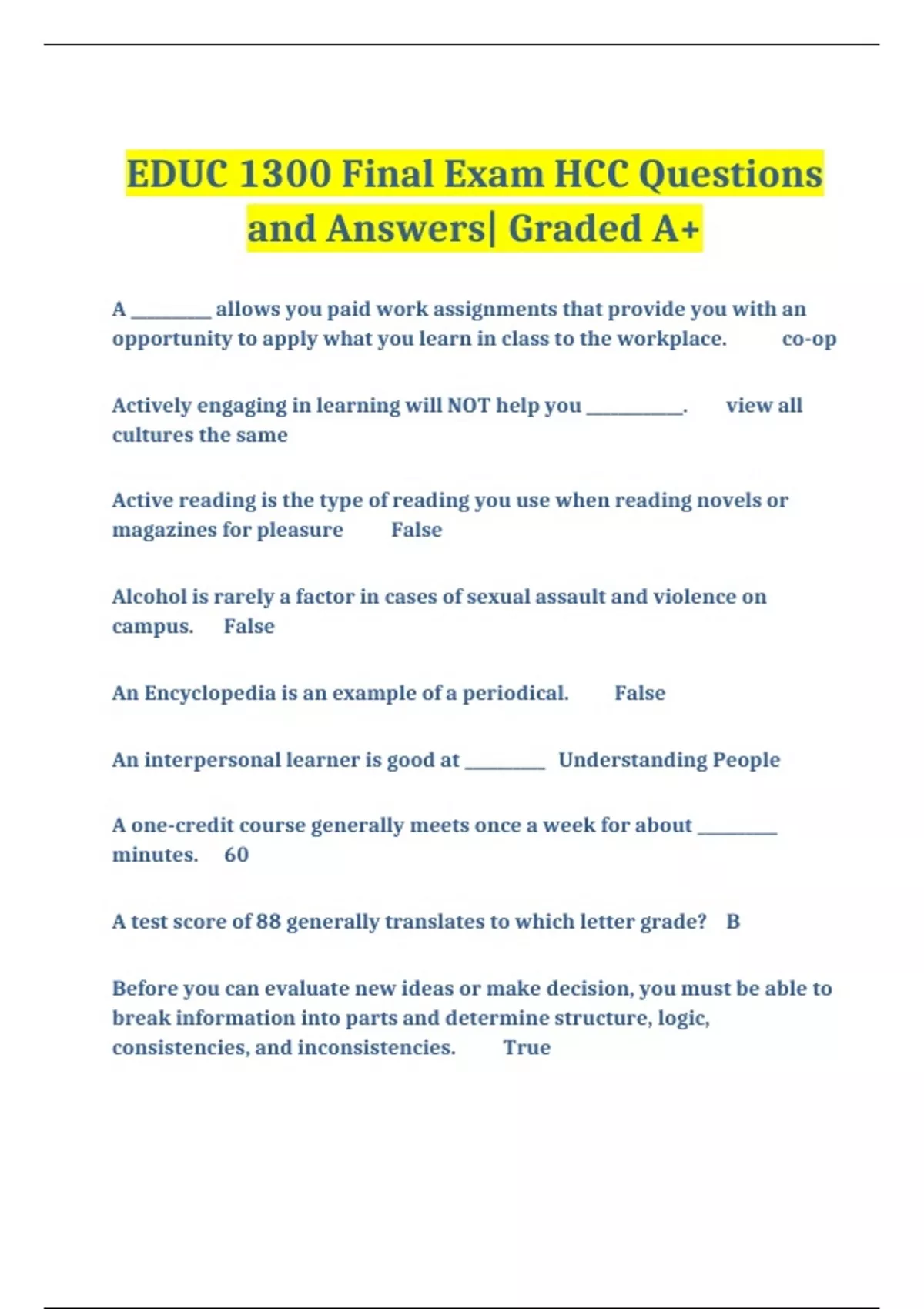 EDUC 1300 Final Exam Test Bundle