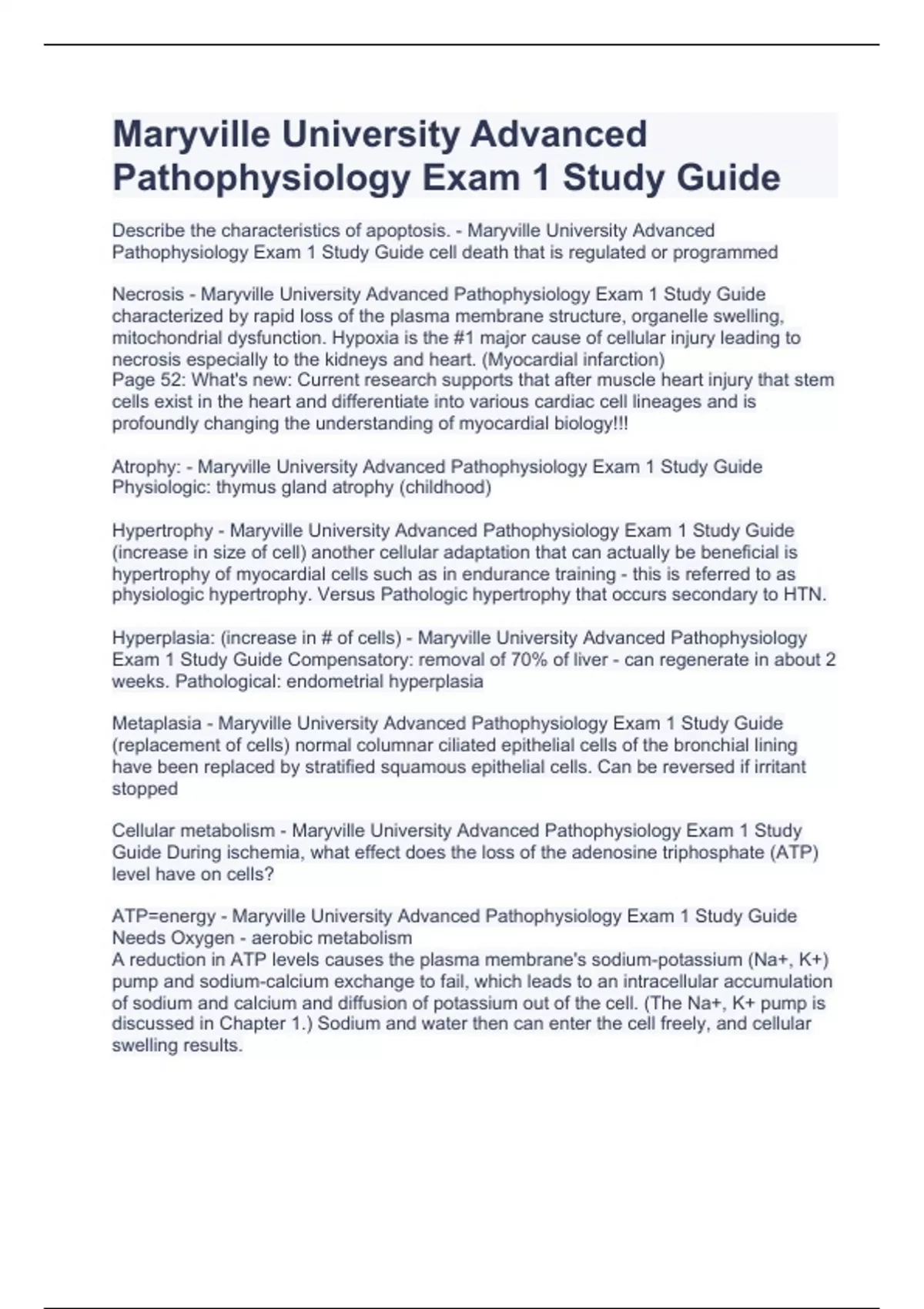Maryville University Advanced Pathophysiology Exam 1 Study Guide Describe the characteristics of apoptosis. - Maryville University Advanced Pathophysiology Exam 1 Study Guide cell death that is regulated or programmed Study Guide characterized by rapid loss of the plasma membrane