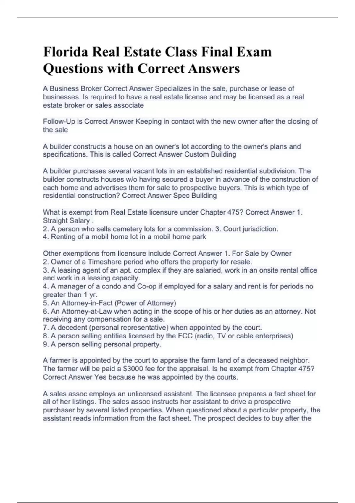 Florida Real Estate Pre-Licensure Exam Prep Material 2023 Questions with Correct Answers Florida Real Estate Final Exam (150 Questions) #1 Questions with Correct Answers (Latest 2023) Florida Real Estate Practice Final Exam Questions with Correct Answers (Latest 2023) Florida Real Estate U Final Exam 2 Questions with 100% Correct Answers (Latest 20