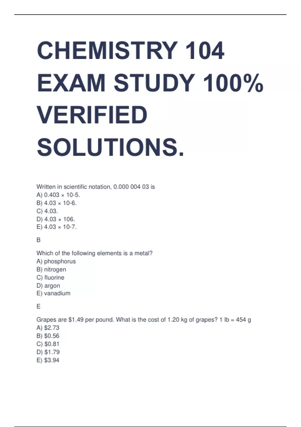 bundle for CHEMISTRY 104 EXAM STUDY 100% VERIFIED SOLUTION