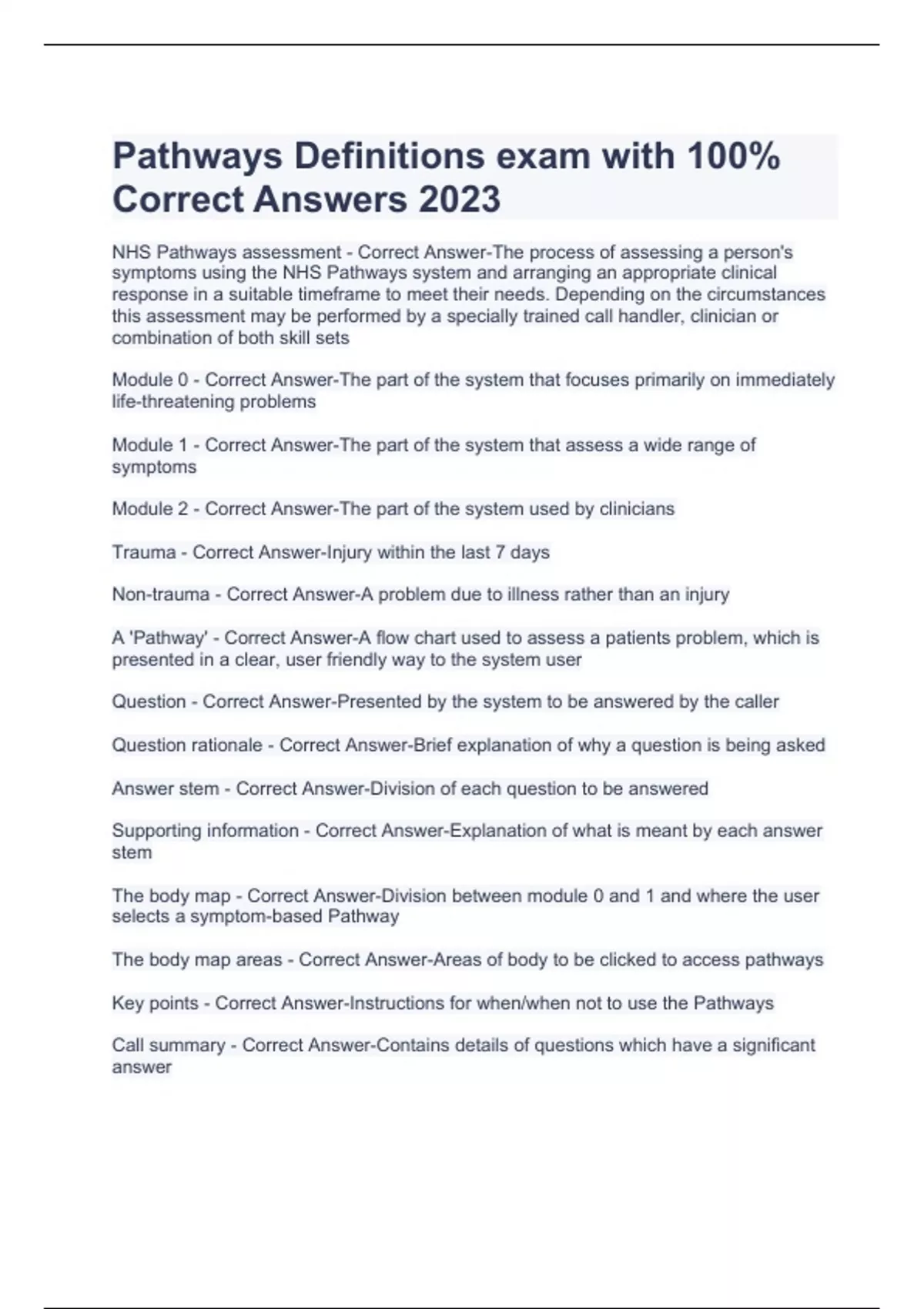 NHS Pathways DLP Questions With 100% Correct Answers 2023 NHS Pathways Assessment 2 with 100% Correct Answers 2023 NHS 111 exam 2 with 100% correct answers 2023 111 NHS Pathways Terminology Exam With 100% Correct Answers 2023 NHS 111 Exam With 100% Correct Answers 2023