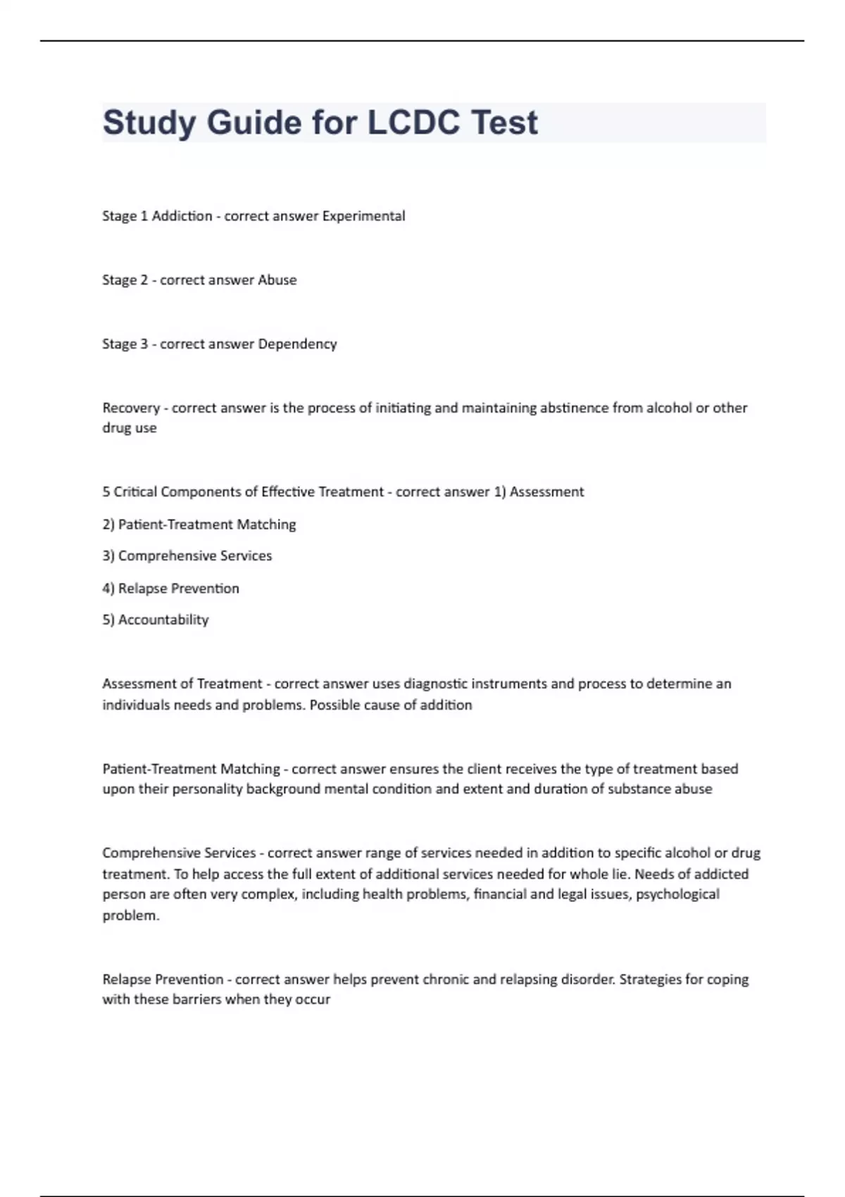 1 Exam (elaborations) IC&RC LCDC EXAM Domain IV (Professional and Ethical Development fully solved 2023 2 Exam (elaborations) LCDC - Assessment question n answers graded A+ 2023 verified to pass 3 Exam (elaborations) LCDC - Counseling question and answers graded A+ 2023 passed 4 Exam (elaborations) LCDC Cards questions and answers 2023 already p