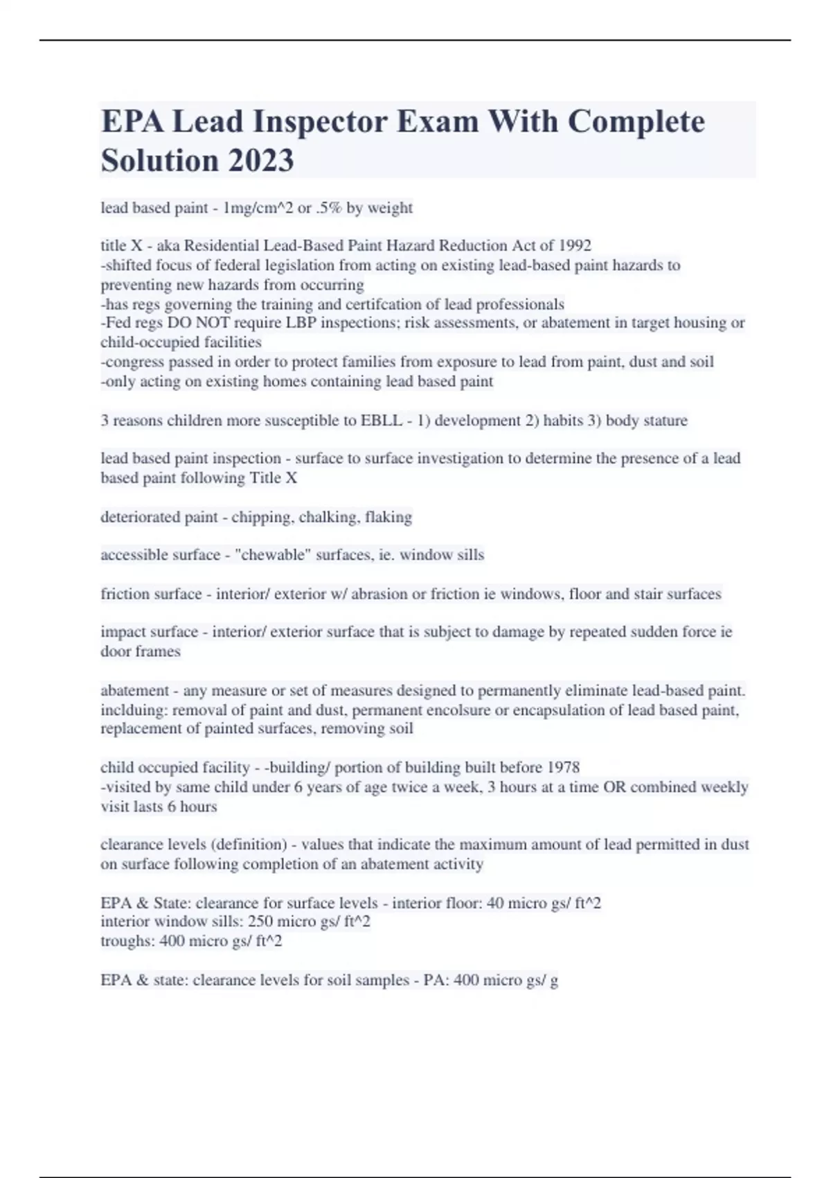 EPA Lead Inspector exam Package Deal 2023