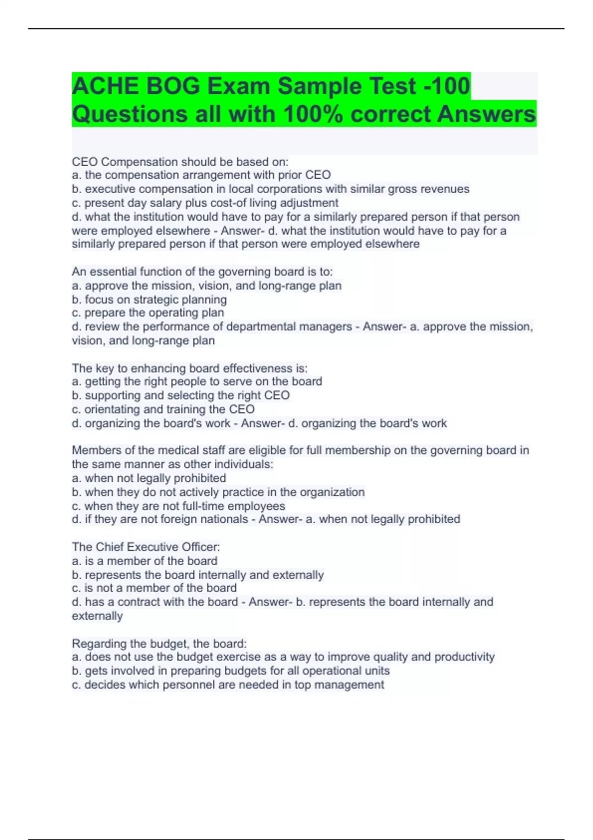 ACHE BOG Exam Sample Test -100 Questions all with 100% correct Answers Past Questions From ACHE s Board of Governors Exam with correct Answers ACHE BOG Sample Test 2023 Questions and Answers ACHE BOG Exam Sample Test -100 Questions and Answers Graded A ACHE FACHE BOG Professionalism and Ethics Exam 2023 ACHE FACHE BOG Healthcare IT and IM Exam Qu