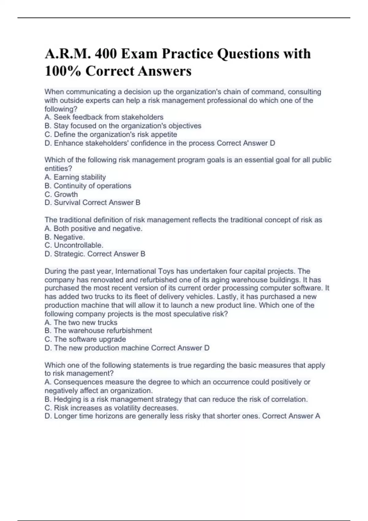 ARM 400 Assignment 1-3 Questions with Correct Answers ARM 400 Concepts Exam Questions with Correct Answers ARM 400 - Risk Management Today Questions with Correct Answers ARM 400 Exam Questions with 100% Correct Answers (Latest 2023) ARM 400 - Risk Management Today Questions with Correct Answers