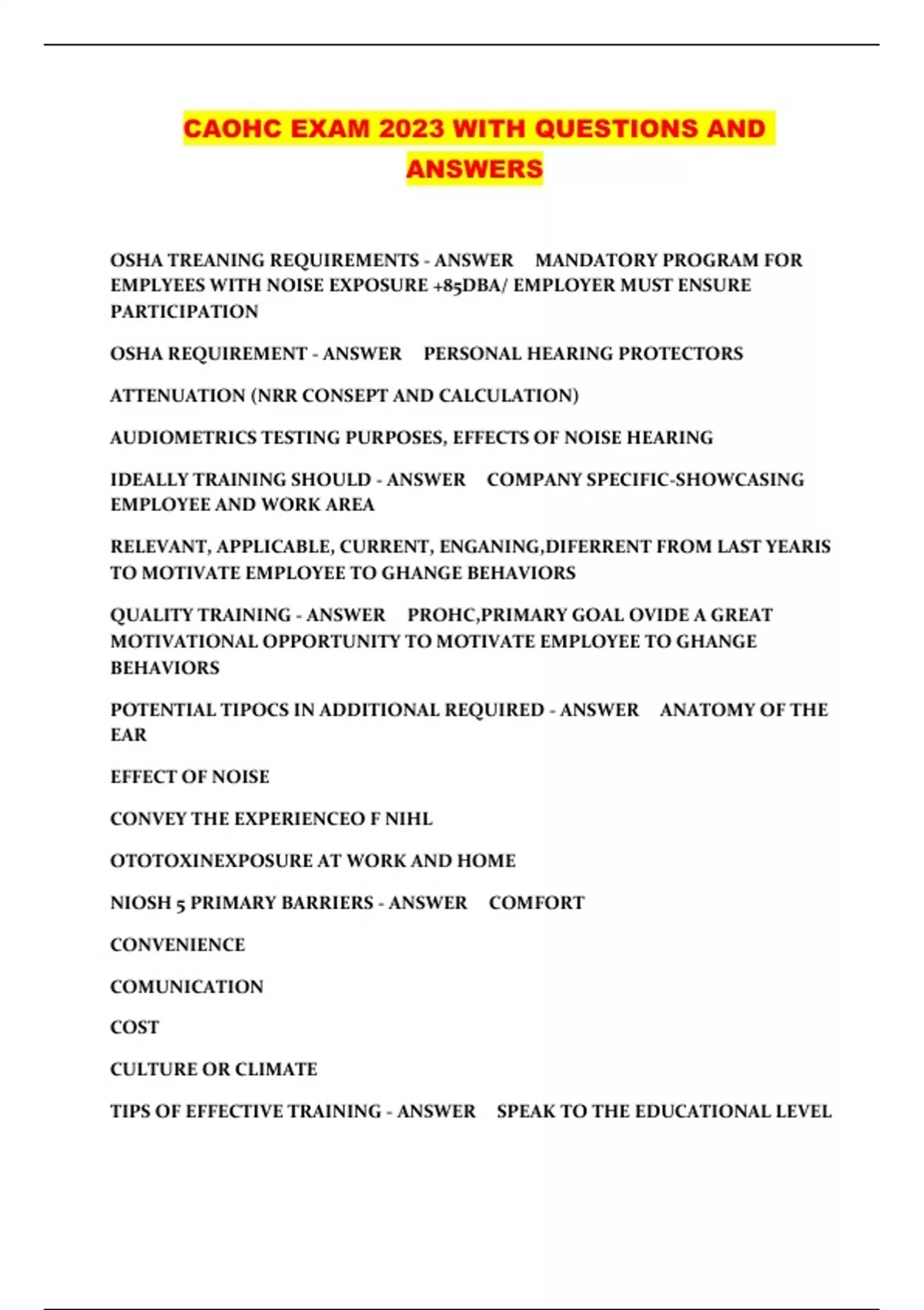 CAOHC EXAM 2023 WITH QUESTIONS AND ANSWERS