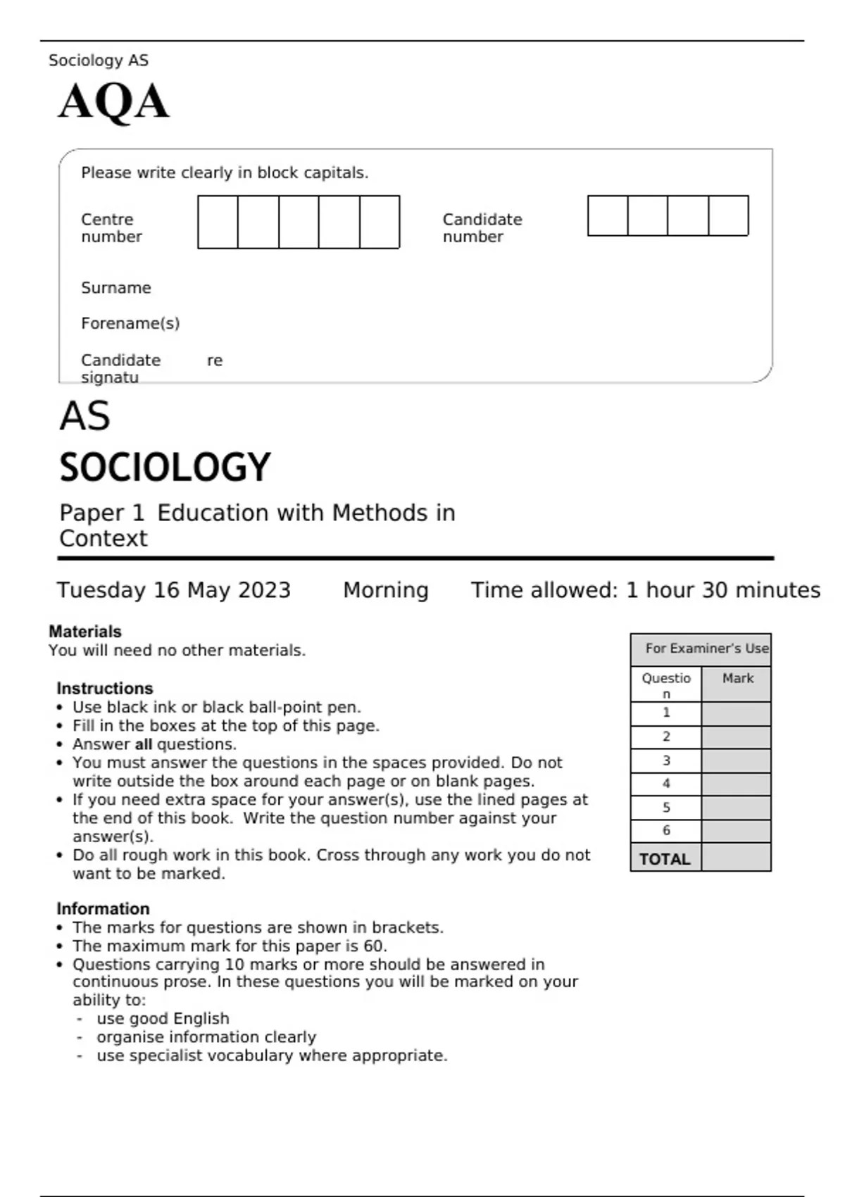 AQA AS SOCIOLOGY Paper 1 MAY 2023 QUESTION PAPER: Education with Methods in Context