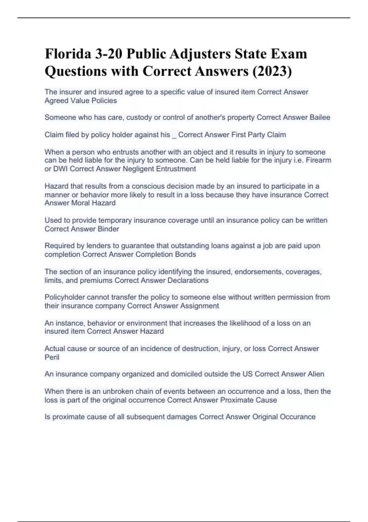 Florida 3-20 Public Adjusters State Exam Questions with Correct Answers (2023)