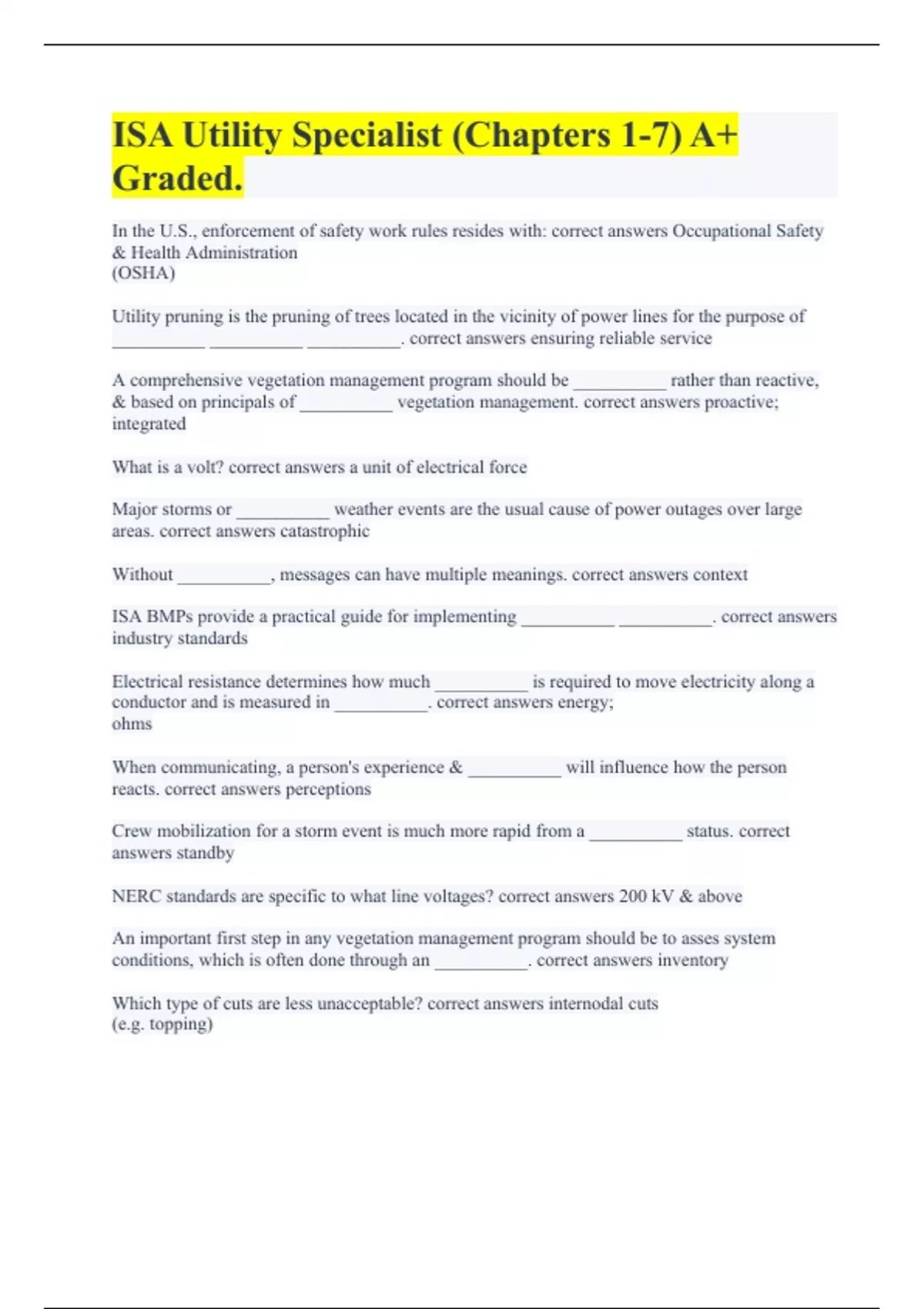 ISA Utility Specialist (Chapters 1-7) A+ Graded. Utility Arboriculture (100% Errorless Answers) ISA Utility Arborist Master Study Set (All Sections) with Complete Solutions. ISA Utility Specialist (Ch. 6: Storm Preparation & Response) with Complete Solutions. ISA Utility Specialist (Ch. 2: Program & Personnel Management) A+ Guaranteed. ISA Utility
