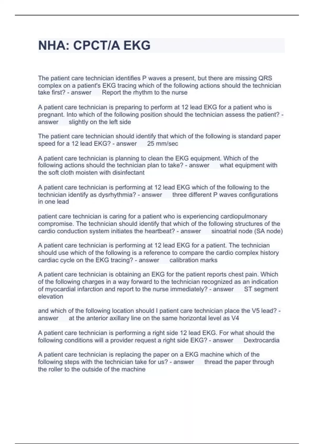 Exam (elaborations) CCMA EKG Review Questions with correct Answers Exam (elaborations) EKG Acquisition Quiz Exam (elaborations) EKG Certification NHA Exam Questions with correct Answers 2023 Exam (elaborations) EKG NHA Exam Questions with correct Answers Exam (elaborations) Ekg NHA Practice test 1 Questions with correct Answers Exam (ela