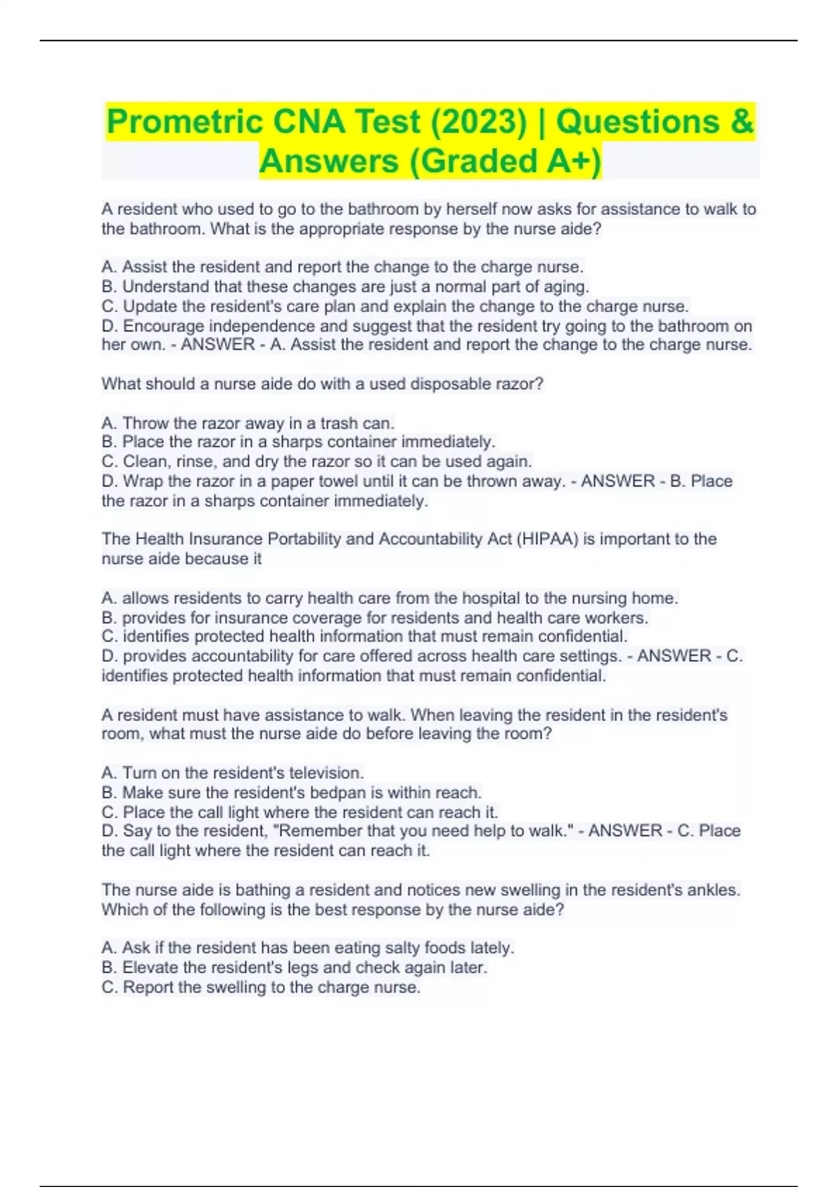 Prometric CNA State Certification Exam BUNDLE || With Complete Questions & Answers (100%Verified- Rated A+)