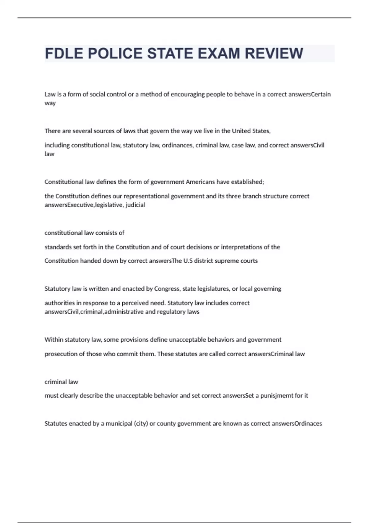 FDLE state exam 2023 with 100% correct answers FDLE State Certification test review 2023 with verified solutions