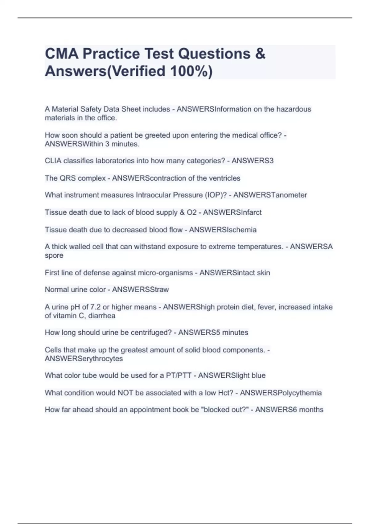 Certified Medical Assistant Practice Exam Correct Questions & Answers!!(FULL SOLUTIONS PACK!!)COMPLETE EXAM BUNDLECertified Medical Assistant Practice Exam Correct Questions & Answers!!(FULL SOLUTIONS PACK!!)COMPLETE EXAM BUNDLECertified Medical Assistant Practice Exam Correct Questions & Answers!!(FULL SOLUTIONS PACK!!)COMPLETE EXAM BUNDLEV