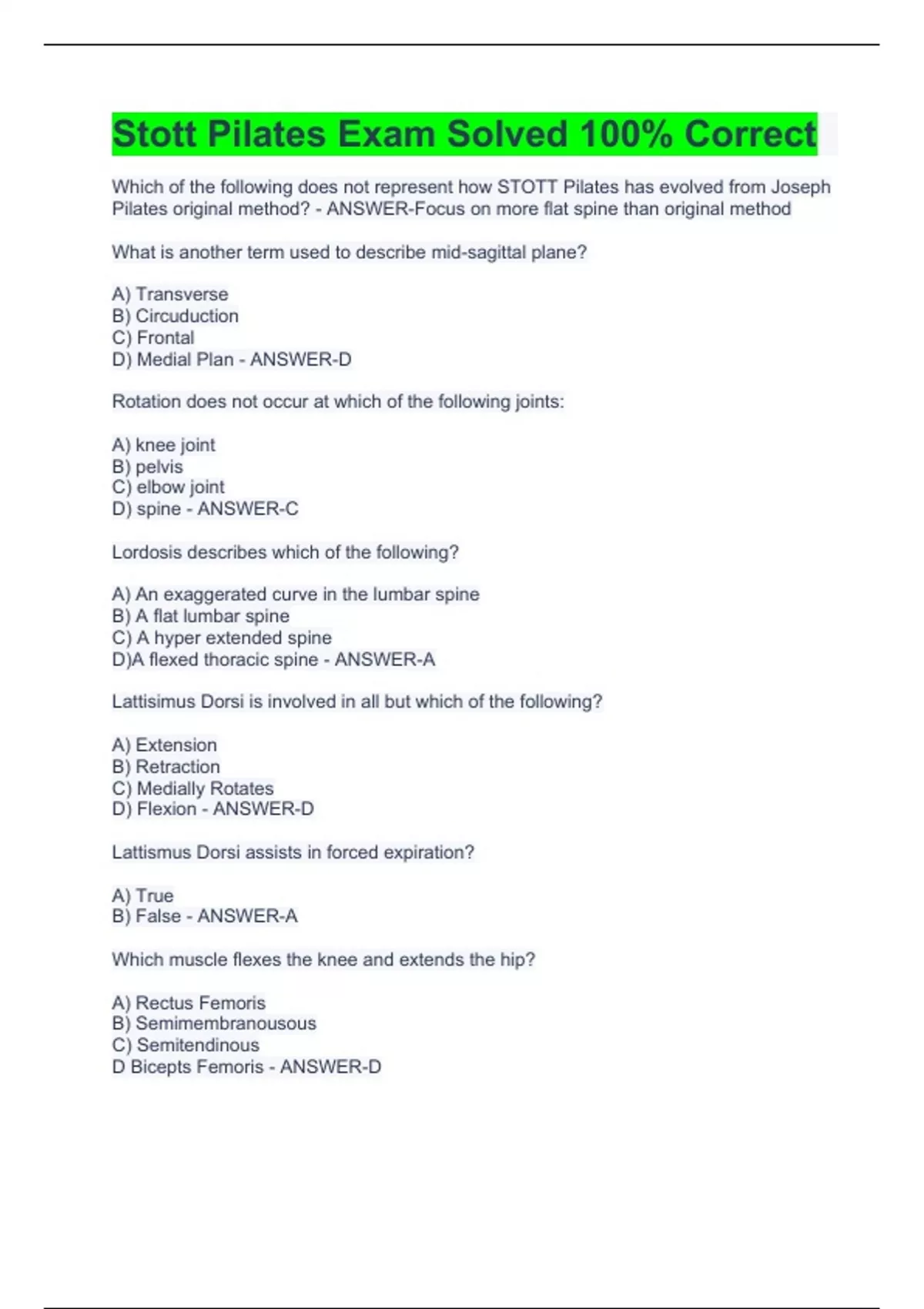 Stott Pilates Exam Solved 100% Correct Stott Pilates Exam Prep Questions and Answers 100% Correct STOTT Pilates Matwork Exam- Muscle Balance- Solved Stott Pilates 2023/24 Written Exam with Complete Solutions Stott Pilates- Exam preparation -Solved -Intermediate Reformer STOTT Essential Reformer Target mm