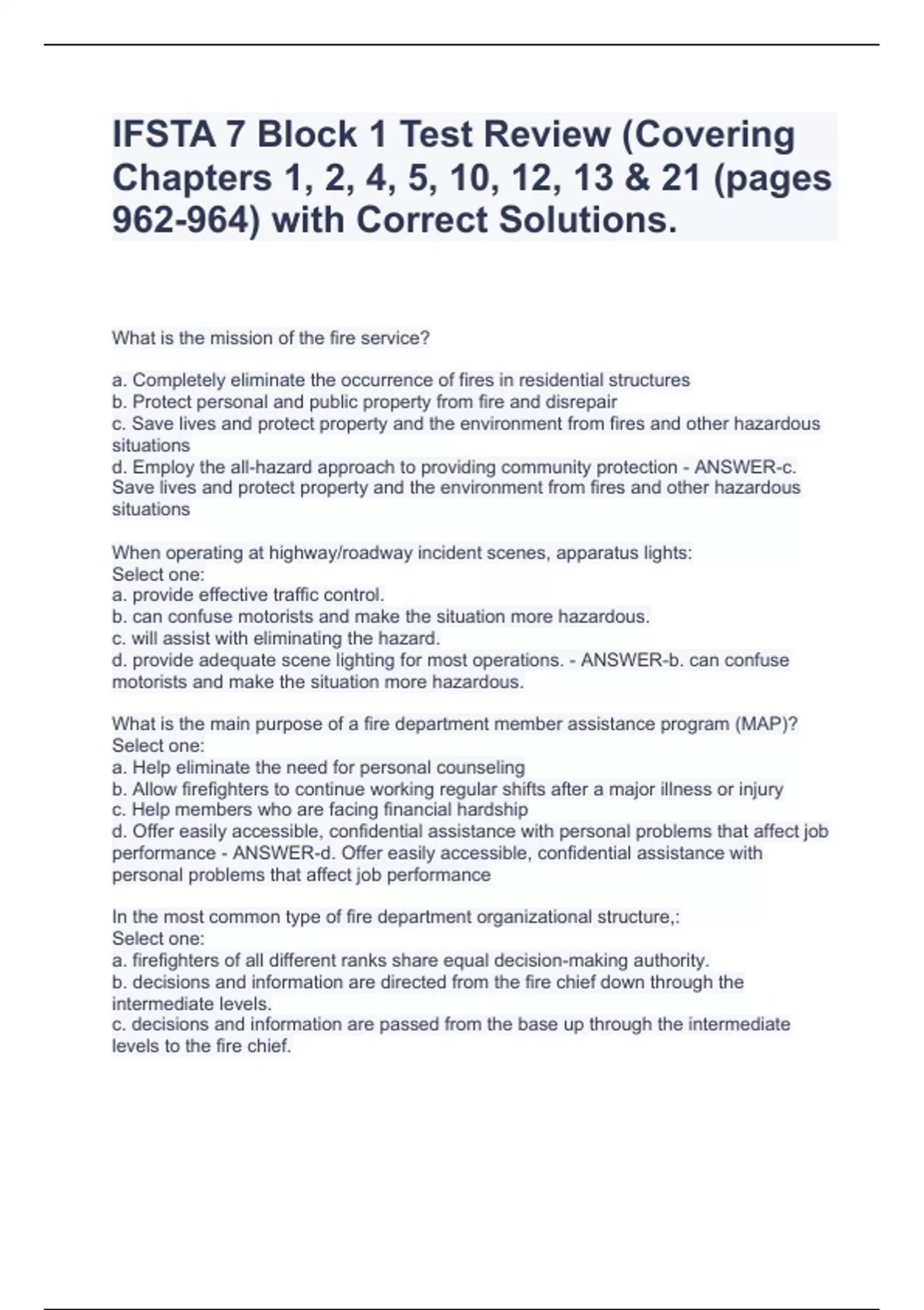 IFSTA 7th ch.14 Exam Questions;IFSTA/Essentials of Fire Fighting 7th Addition - Chapter 3 Questions & Answers(Graded A+);IFSTA 7th Edition Chapter 4: Fire Dynamics Questions;FF2 Final Exam Study Guide IFSTA with Complete Solutions(RATED A);FF1 Final Exam Study Guide IFSTA (All Of The Quiz Questions For Chapter 1-15) with Complete Solutions