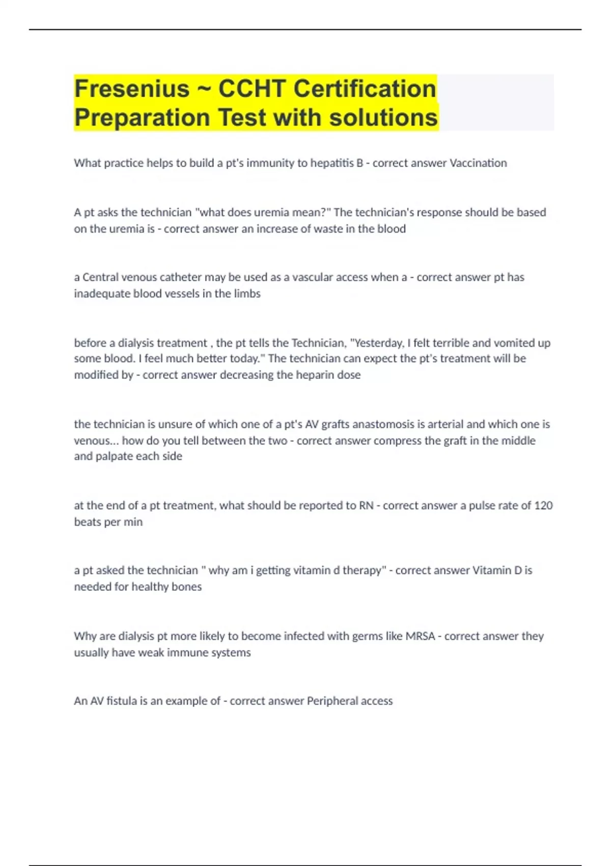 Fresenius ~ CCHT Certification Preparation Test with solutions