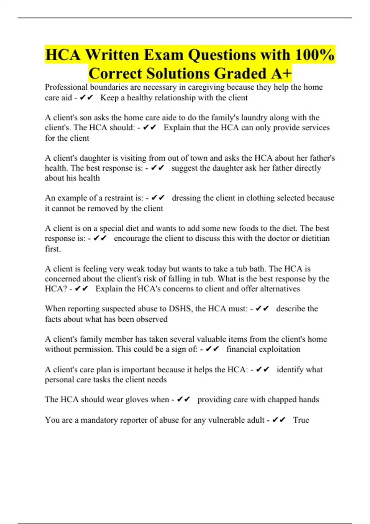 HCA Test Questions with Answers Exam Bundle