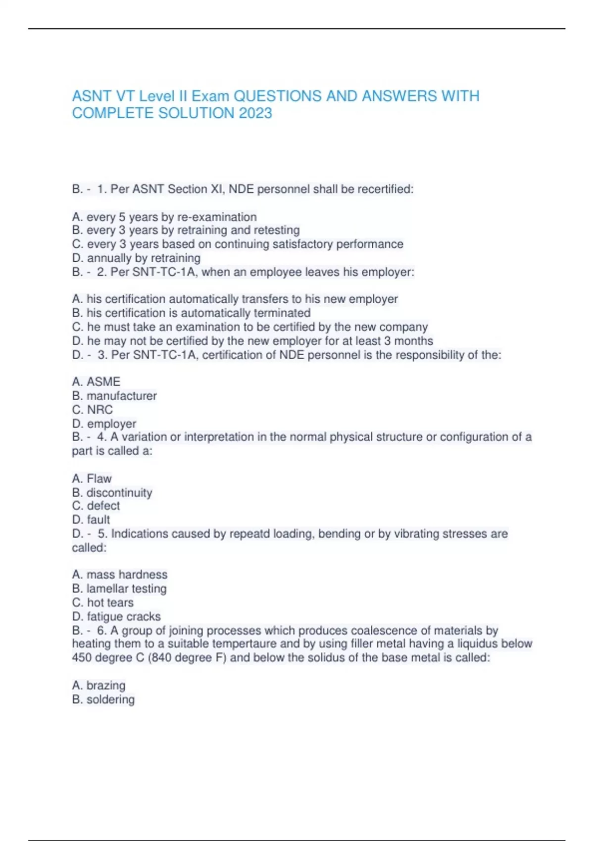 ASNT VT Level II Exam QUESTIONS AND ANSWERS WITH COMPLETE SOLUTION 2023,ASNT VT THEORY QUESTIONS With Complete Answers,ASNT Level II Study Guide with complete solution.,ASNT Visual Testing Level 2 Exam with complete solution Questions And Answers Solved 100% Correct!!