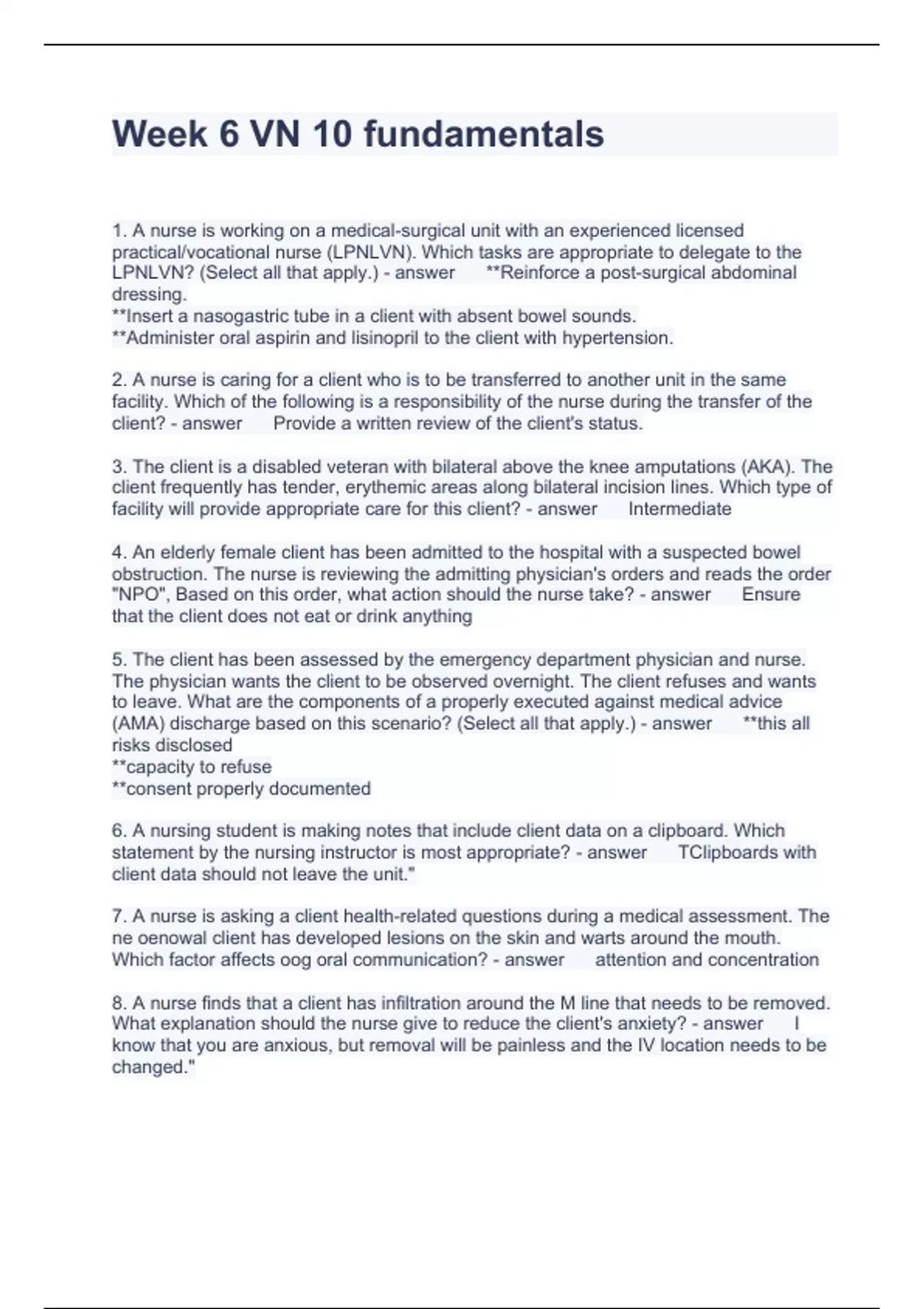Week 6 VN 10 fundamentals Questions with complete