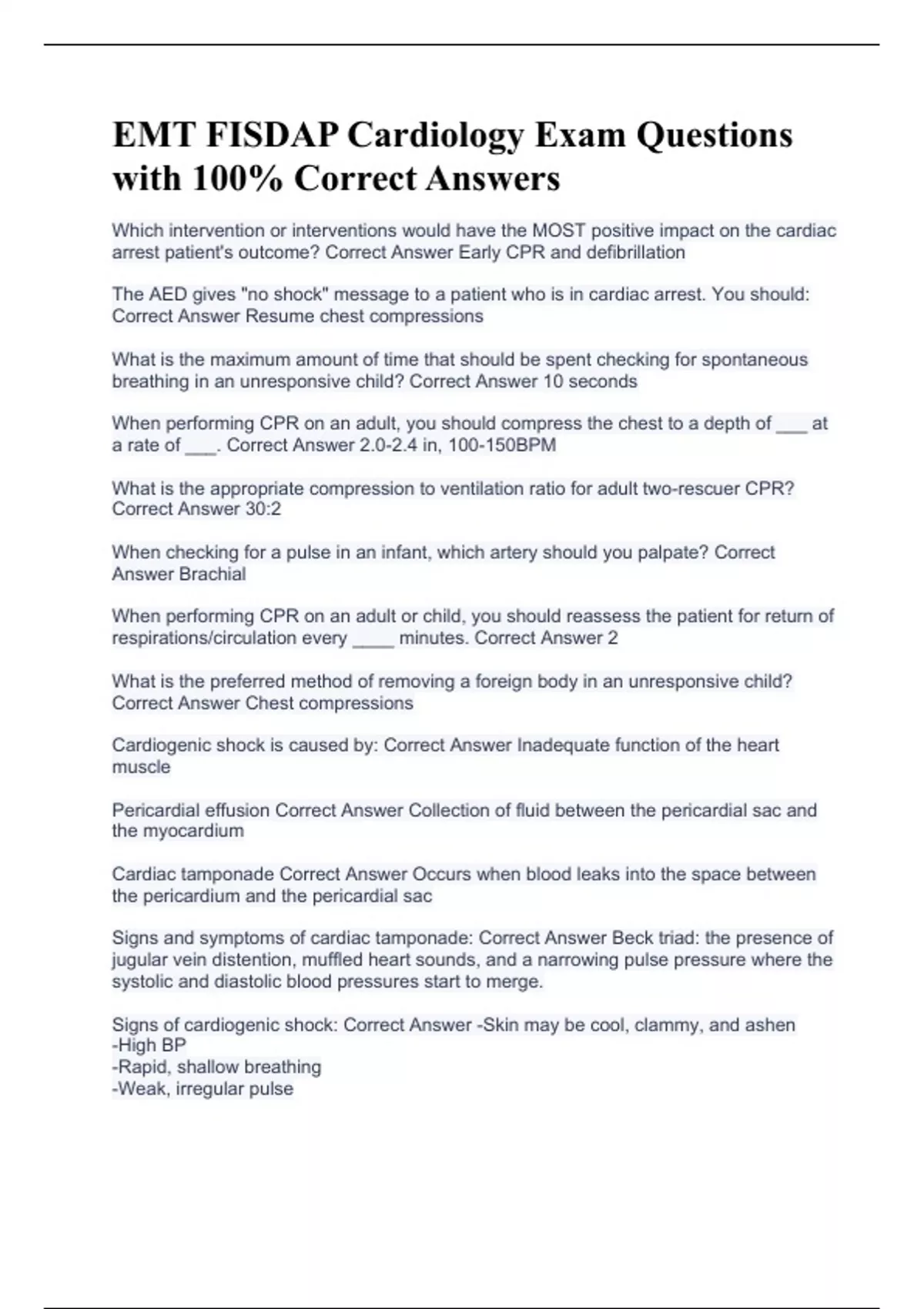 FISDAP EMT Cardiology Practice Test Questions with 100% Correct Answers EMT FISDAP Cardiac Exam Review Questions with 100% Correct Answers EMT FISDAP Cardiology Exam Questions with 100% Correct Answers EMT Cardiology FISDAP Exam Questions with 100% Correct Answers Cardiology Fisdap Exam for EMT Exam Questions with 100% Correct Answers