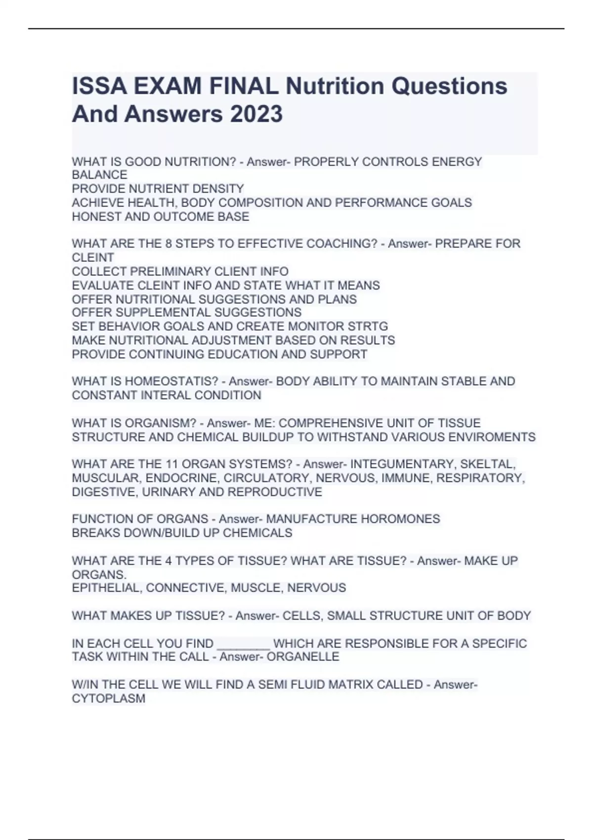 ISSA Nutrition Unit 18: Special Nutrition Scenarios Questions And Answers 2023 ISSA Sports Nutrition Unit 1 Quiz Questions And Answers Approximately what percentage of a cell s mass is comprised of water? ISSA FITNESS NUTRITION QUESTIONS AND ANSWERS 2023 ISSA EXAM FINAL Questions And Answers With Complete Solutions ISSA Nutritionist Questions And