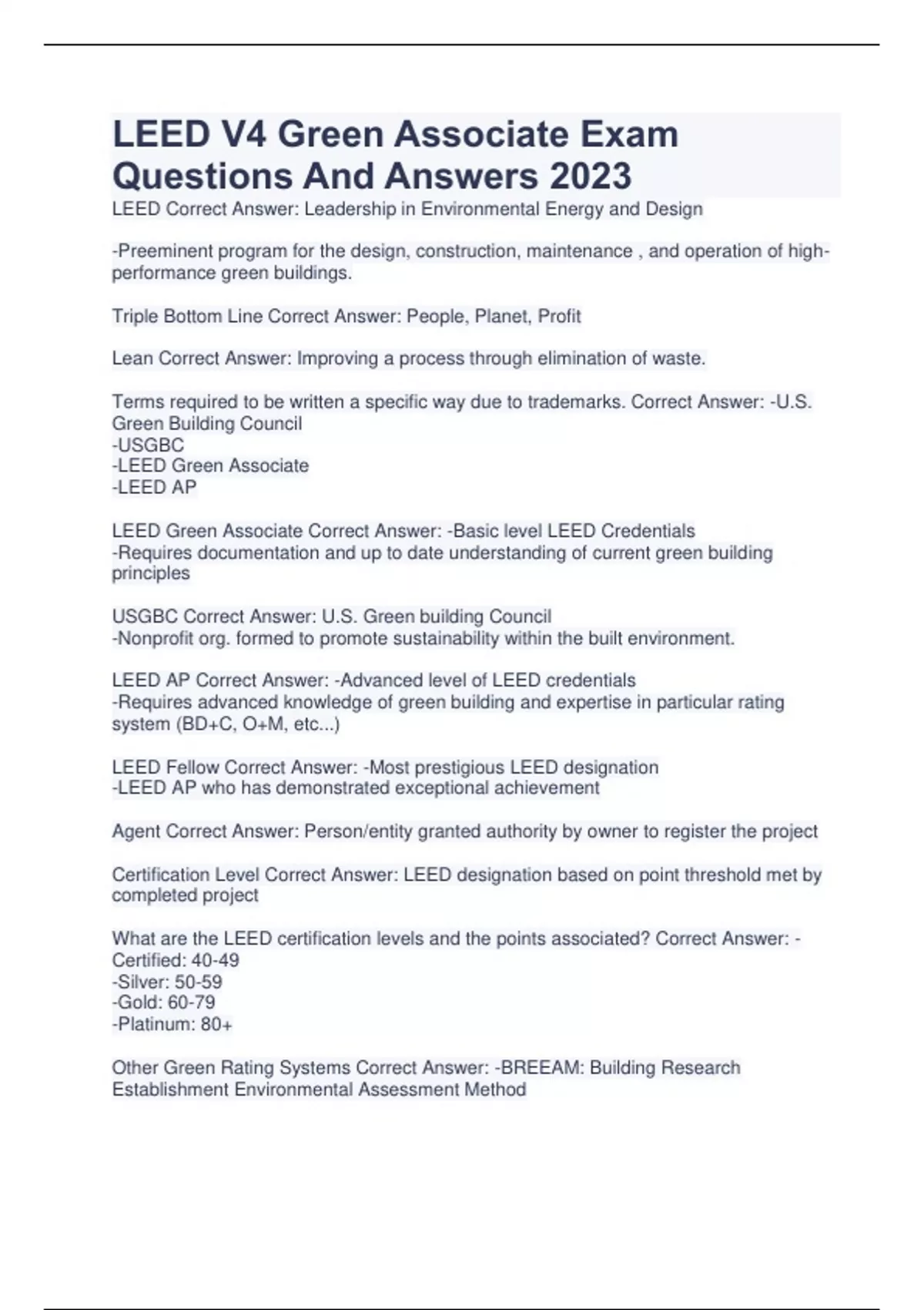 LEED GREEN ASSOCIATE Complete Study Exam Package With Verified Solutions 2023 LEED Green Associate Exam Complete Questions And Answers LEED Green Associate V4: LEED Process Complete Questions And Answers LEED Green Associate Exam Prep (Chapter 4) Complete Questions And Answers