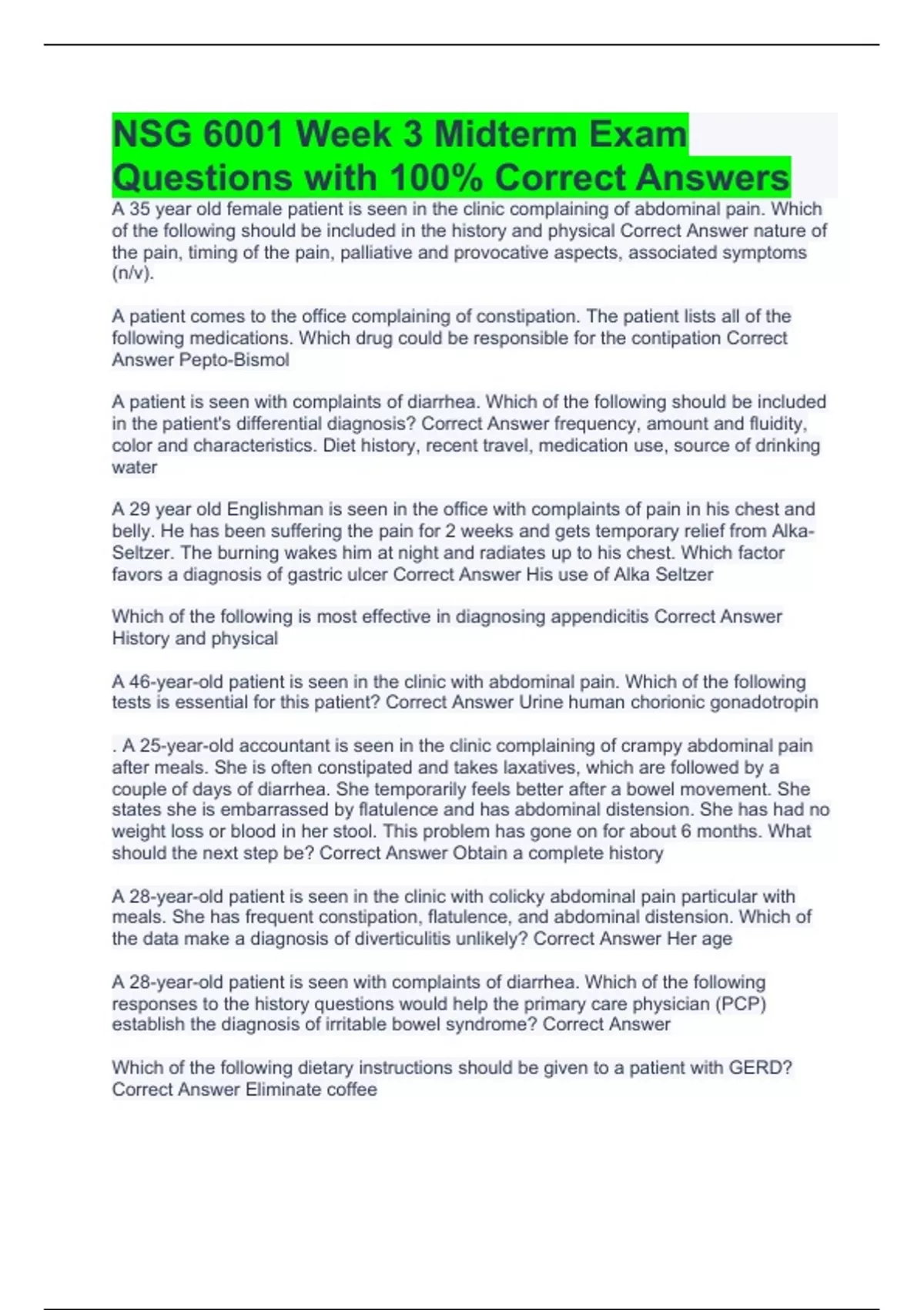 NSG 6001 U2 Section 4. Ear, Nose, and Throat Problems Questions with 100% Correct Answers NSG 6001 U1 Chapter 3. Health Promotion Exam Questions with Correct Answers NSG 6001 Week 4 Questions with 100% Correct Answers Advanced Nursing NSG 6001 Exam Questions with 100% Correct Answers Nursing 6001 Exam 1 Questions with 100% Correct Answers (A+ Grade