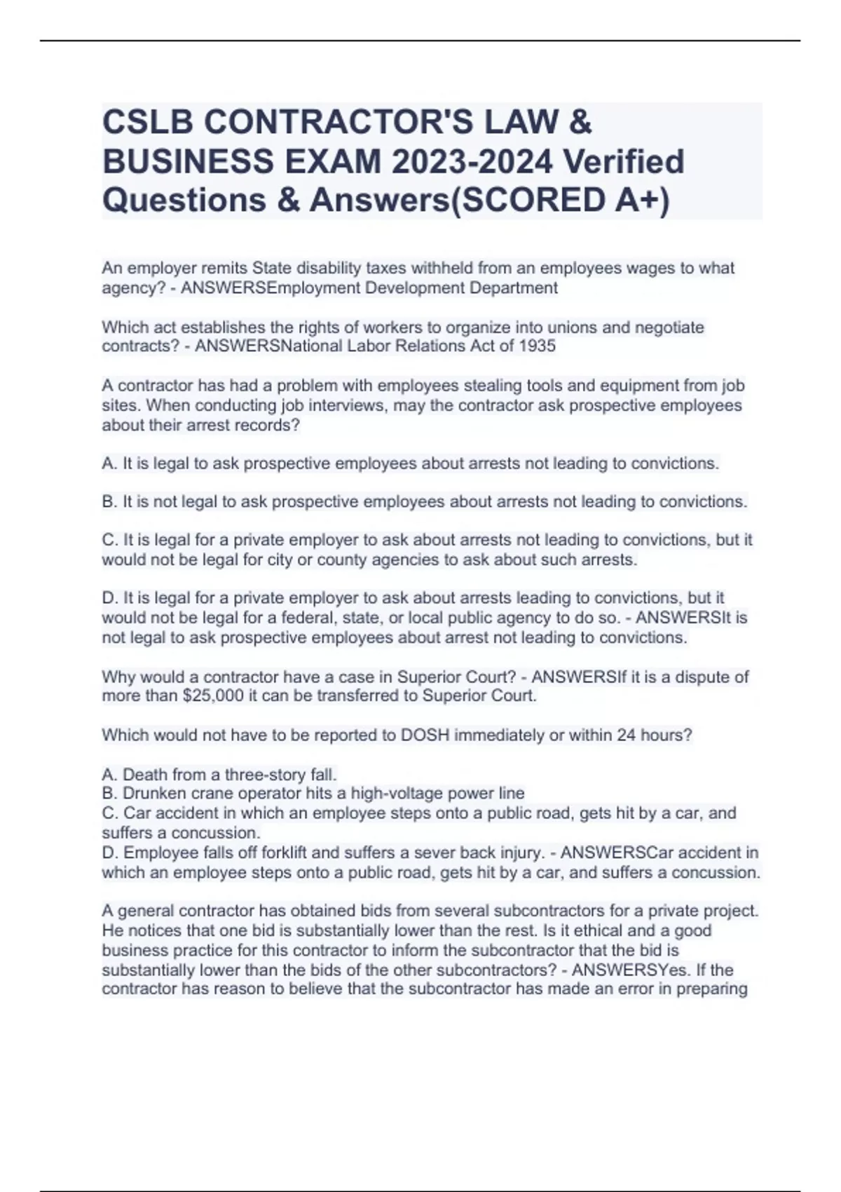 CSLB Exam Law and Business Questions & Answers(RATED A)