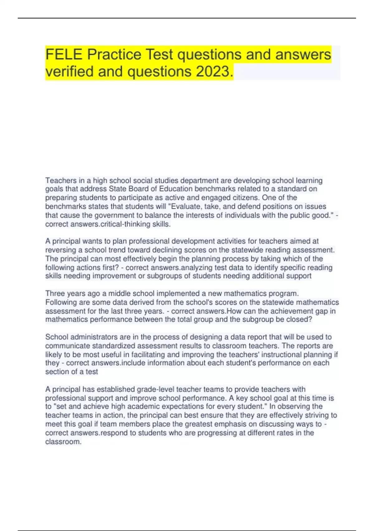FELE Practice Test questions with complete solutions 100% guaranteed success.