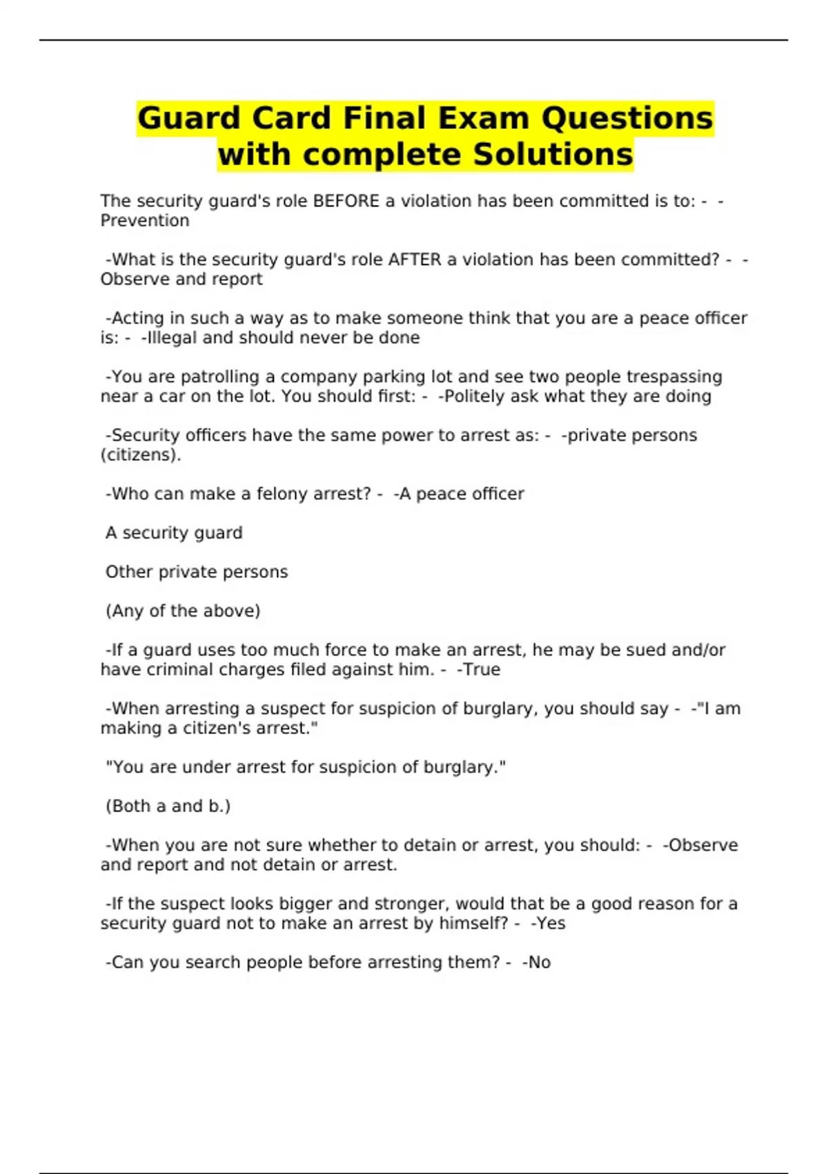 Guard Card Final Exam Questions with complete Solutions
