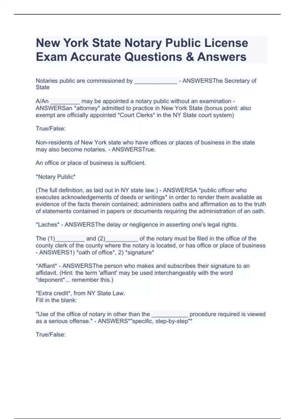 NY State Notary Public Definitions Questions & Answers Correct 100%