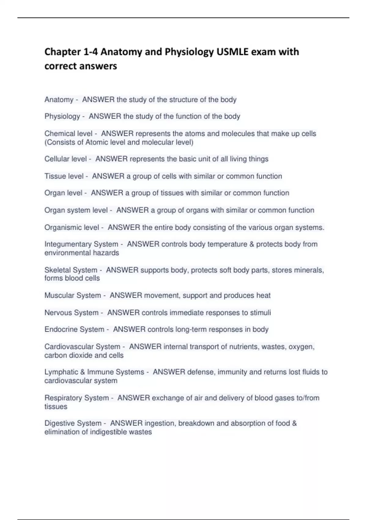 Chapter 1-4 Anatomy and Physiology USMLE exam with correct answers