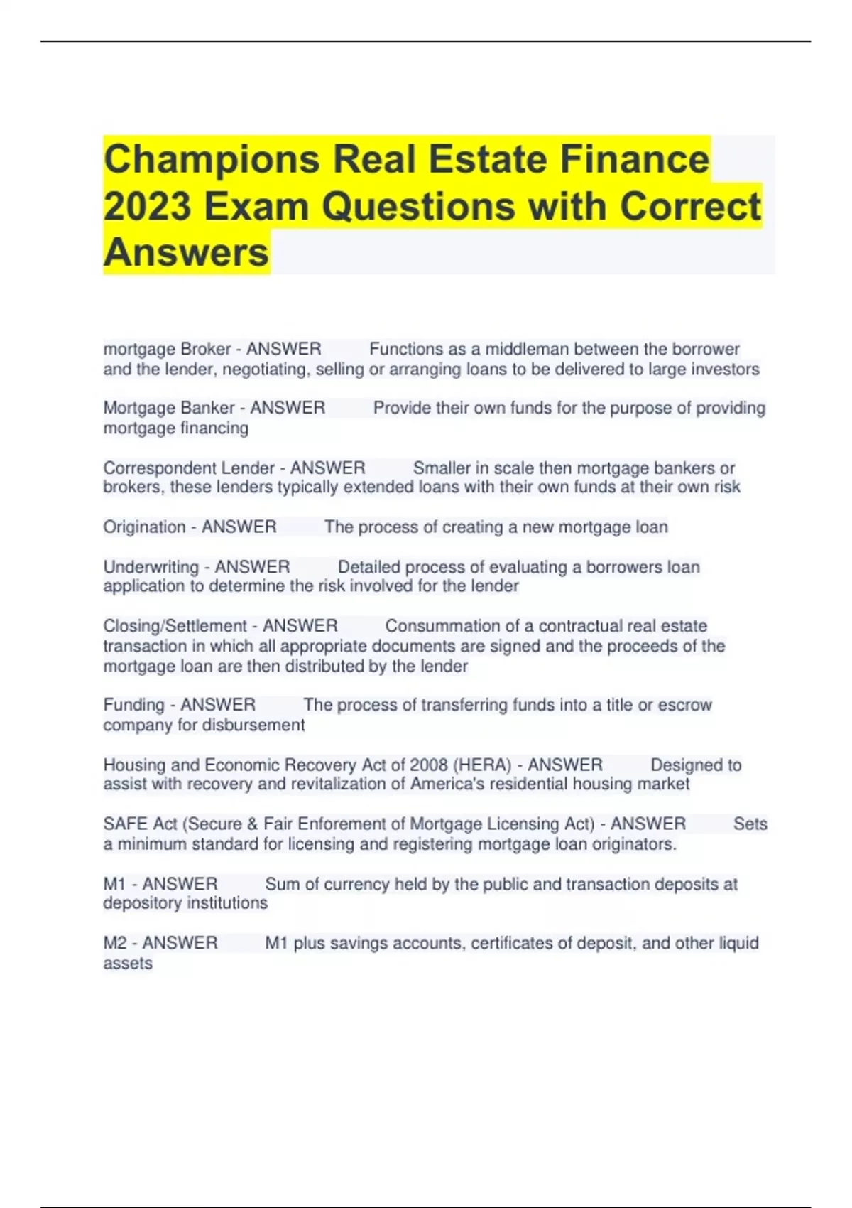 Bundle For Champions Real Estate Finance Exam Questions with All Correct Answers