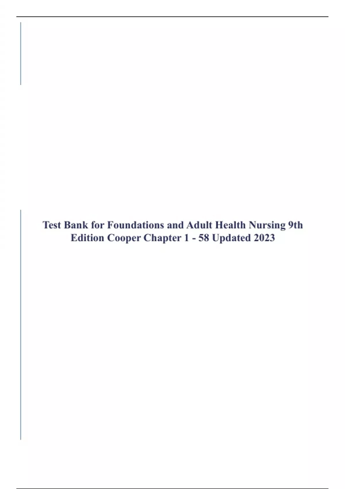 1 Exam (elaborations) Test Bank for Foundations and Adult Health Nursing 8th Edition Cooper Chapter 1 - 58 Updated 2023 2 Exam (elaborations) Test Bank for Foundations and Adult Health Nursing 9th Edition Cooper Chapter 1 - 58 Updated 2023