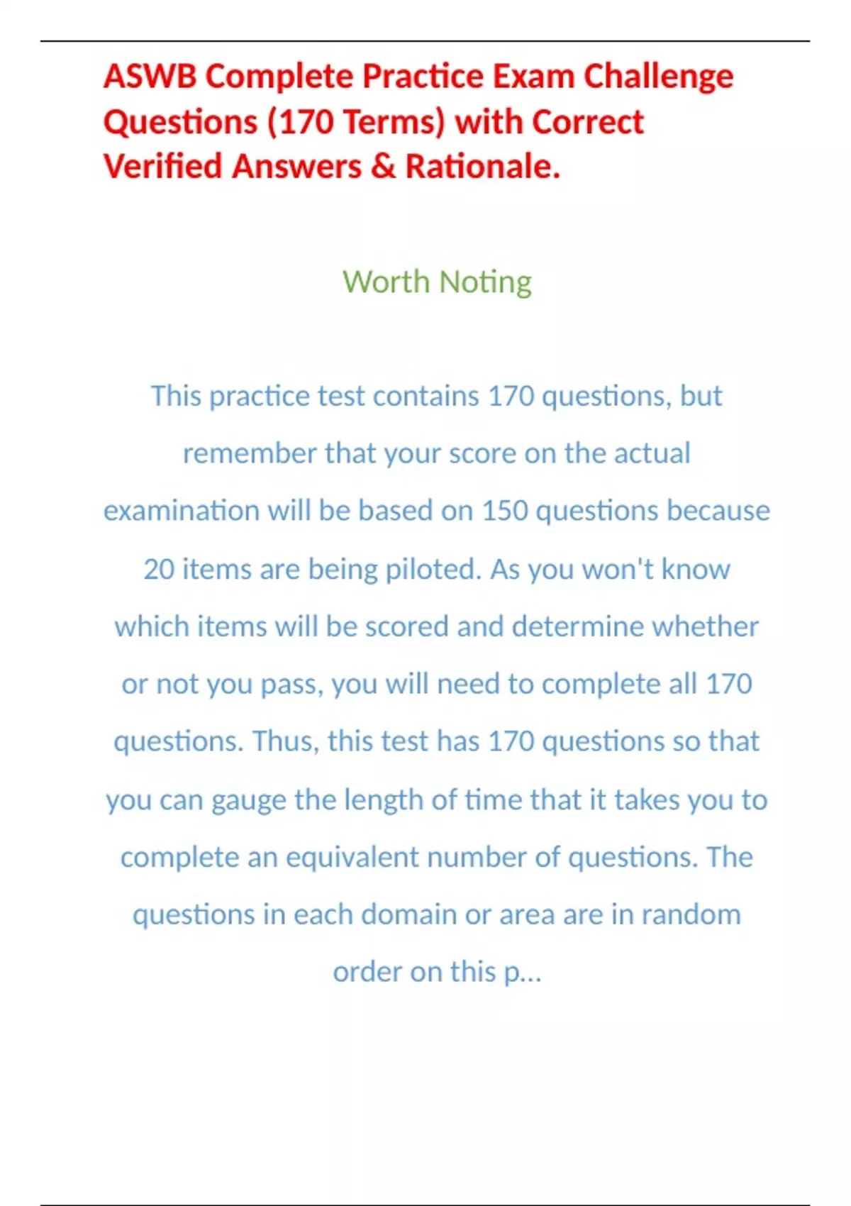 1 Exam (elaborations) Exam Master Complete Study Guide Review Containing 597pgs (1,287 Answered Questions) . 2 Exam (elaborations) ASWB Bachelors Exam Latest Review with Solutions (291 Qs & Ans) 2023 3 Exam (elaborations) ASWB Masters Exam Review with 411 Correctly Answered Questions Update 2023. 4 Exam (elaborations) ASWB Complete Prac