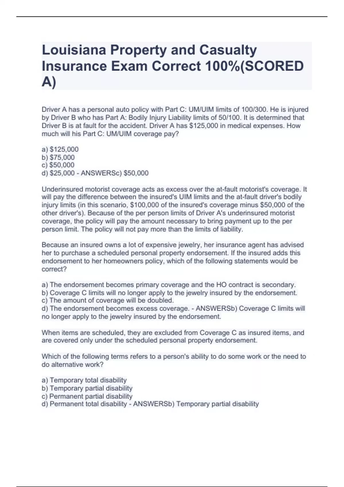 Louisiana P&C Adjuster Exam Prep Correct 100%(SCORED A)