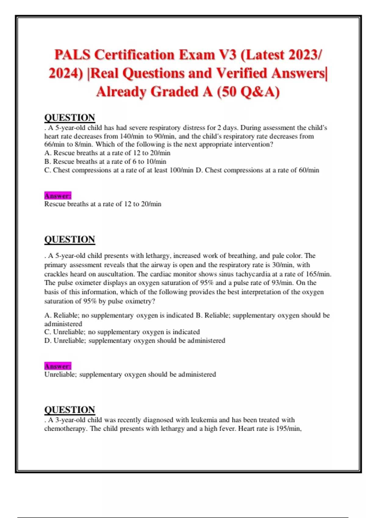 PALS Certification Exam V3 (Latest 2023/ 2024) |Real Questions and Verified Answers| Already Graded A (50 Q&A)
