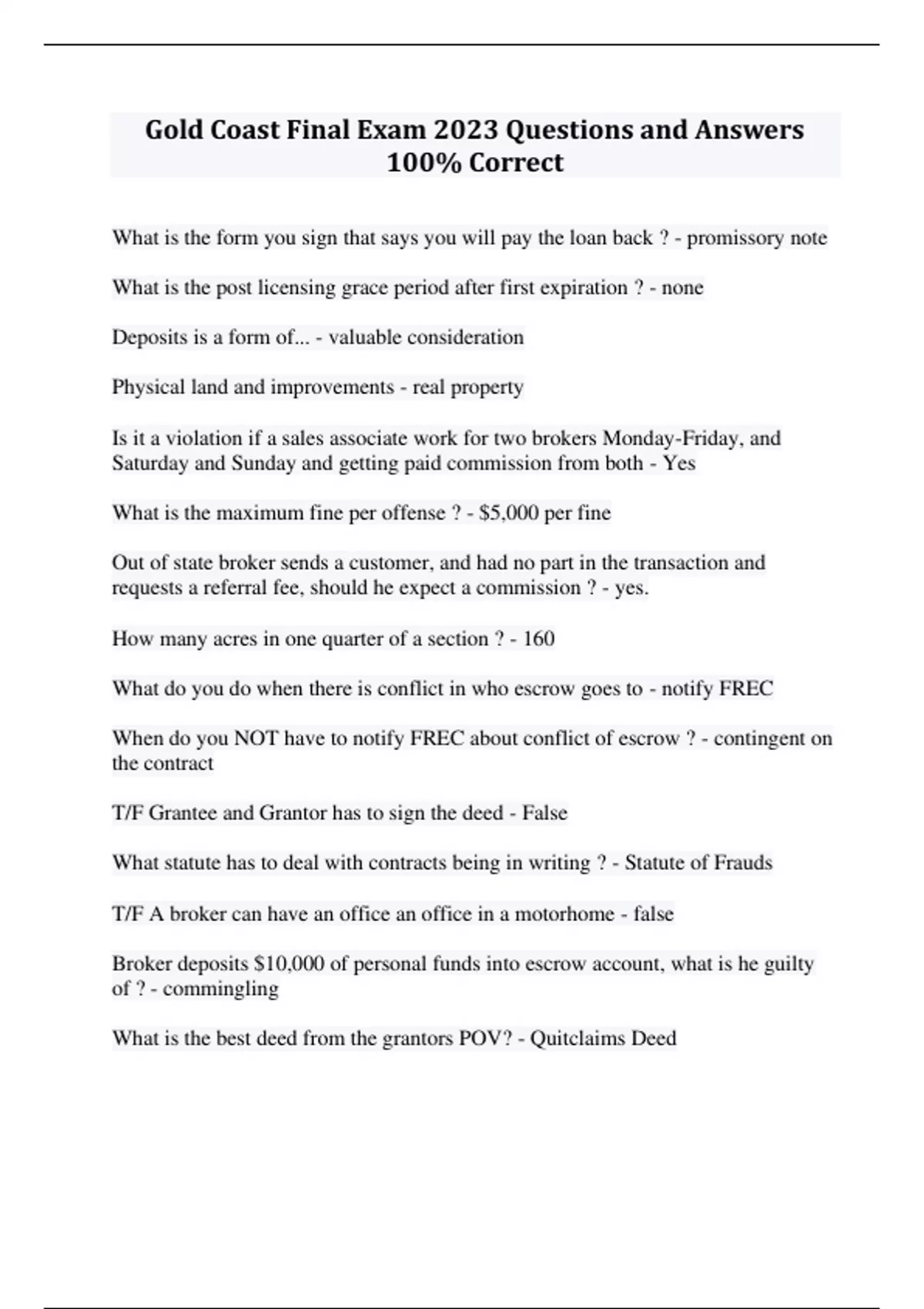 Gold Coast Real Estate Final Exam WITH COMPLETE SOLUTIONS COMPLETE STUDY GUIDE BUNDLE 2023