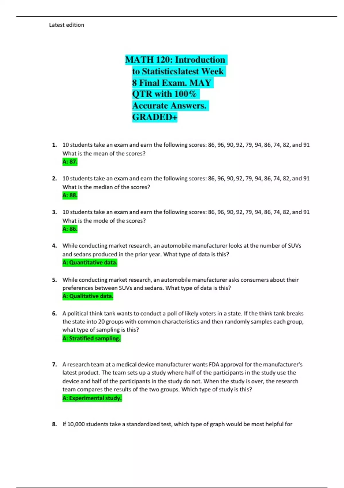A PACKAGE DEAL FOR MATH 120 EXAMS : WEEK 1-8 EXAMS & WEEK 5AND 7 QUIEZES(A+ GRADE ASSURED)