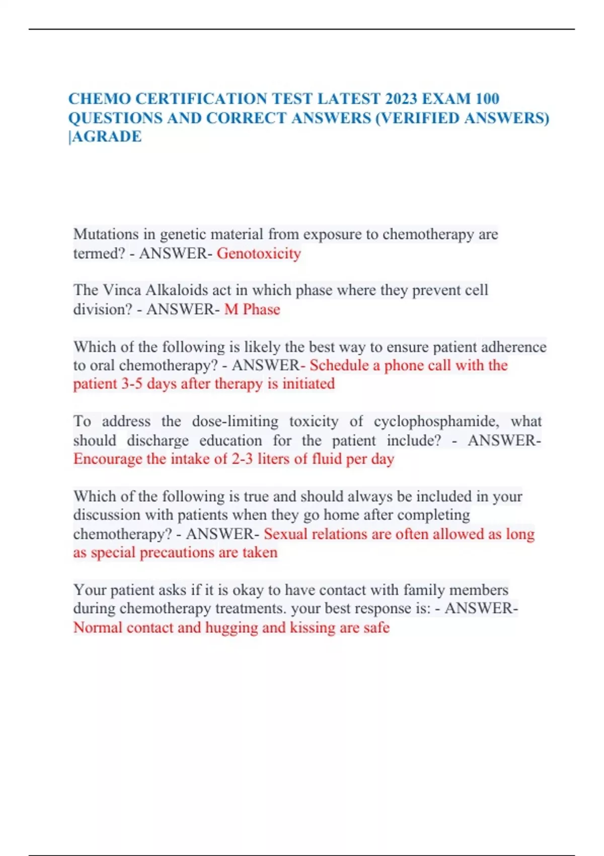 CHEMO CERTIFICATION TEST LATEST 2023 EXAM 100 QUESTIONS AND CORRECT ANSWERS (VERIFIED ANSWERS) |AGRADE