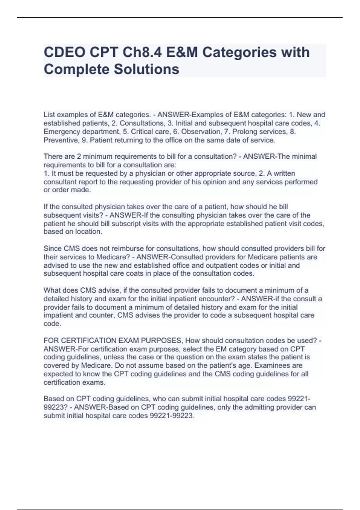 CDEO CPT Ch8.4 E&M Categories with Complete Solutions