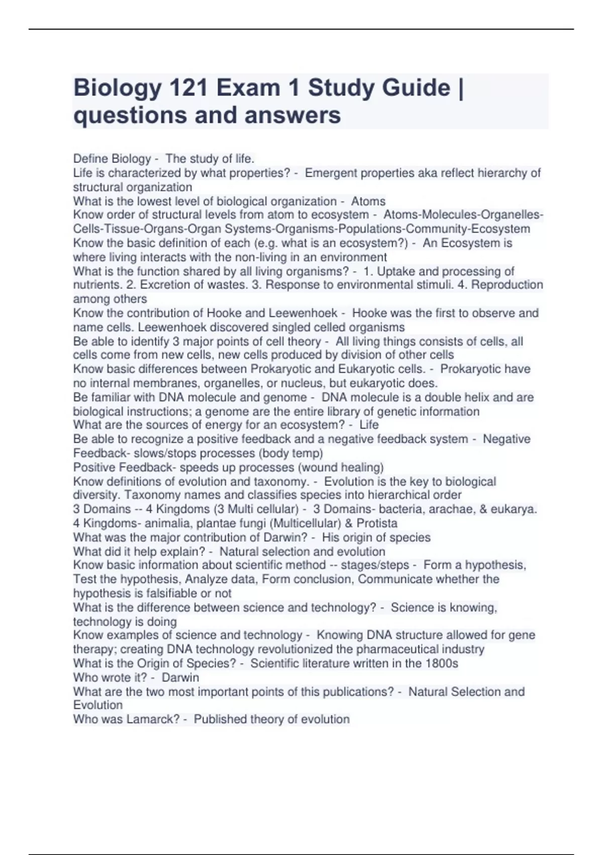 BIO 121 Exam 1 Chapters 1-5 | updated questions and answers,Biology 121 Final Exam | 2023/24,Exam (elaborations) Biology 121 Exam 1 Study Guide | questions and answer,Biology 121 EXAM 1 Chapters 1-3 | updated questions and answers
