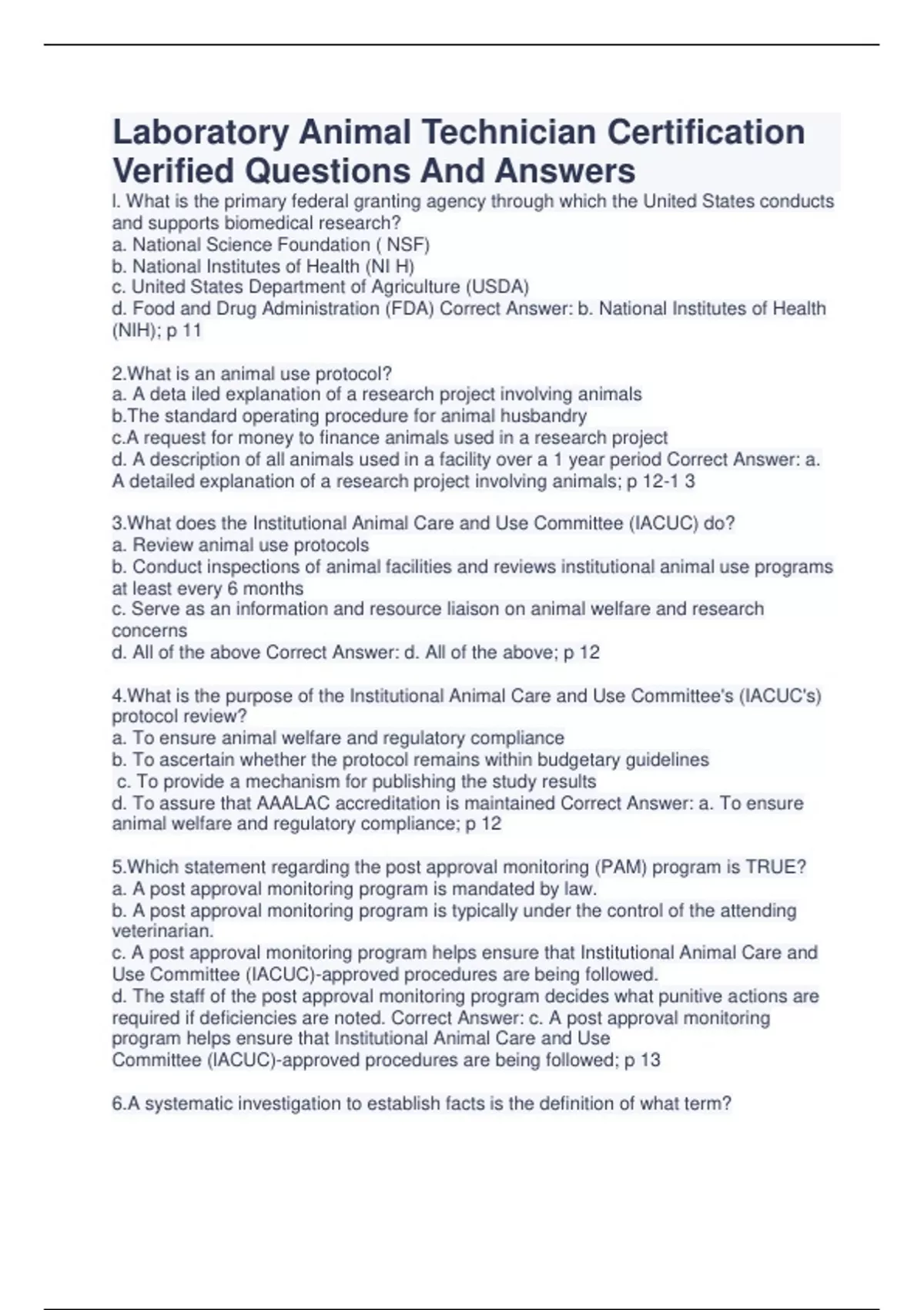 Laboratory Animal Technician Certification Verified Package With Latest Deal ALAT Unit 1- Introduction To Laboratory Animal Care Questions And Answers 2023 Lab Animal Final Exam Complete Questions And Answers Graded A+
