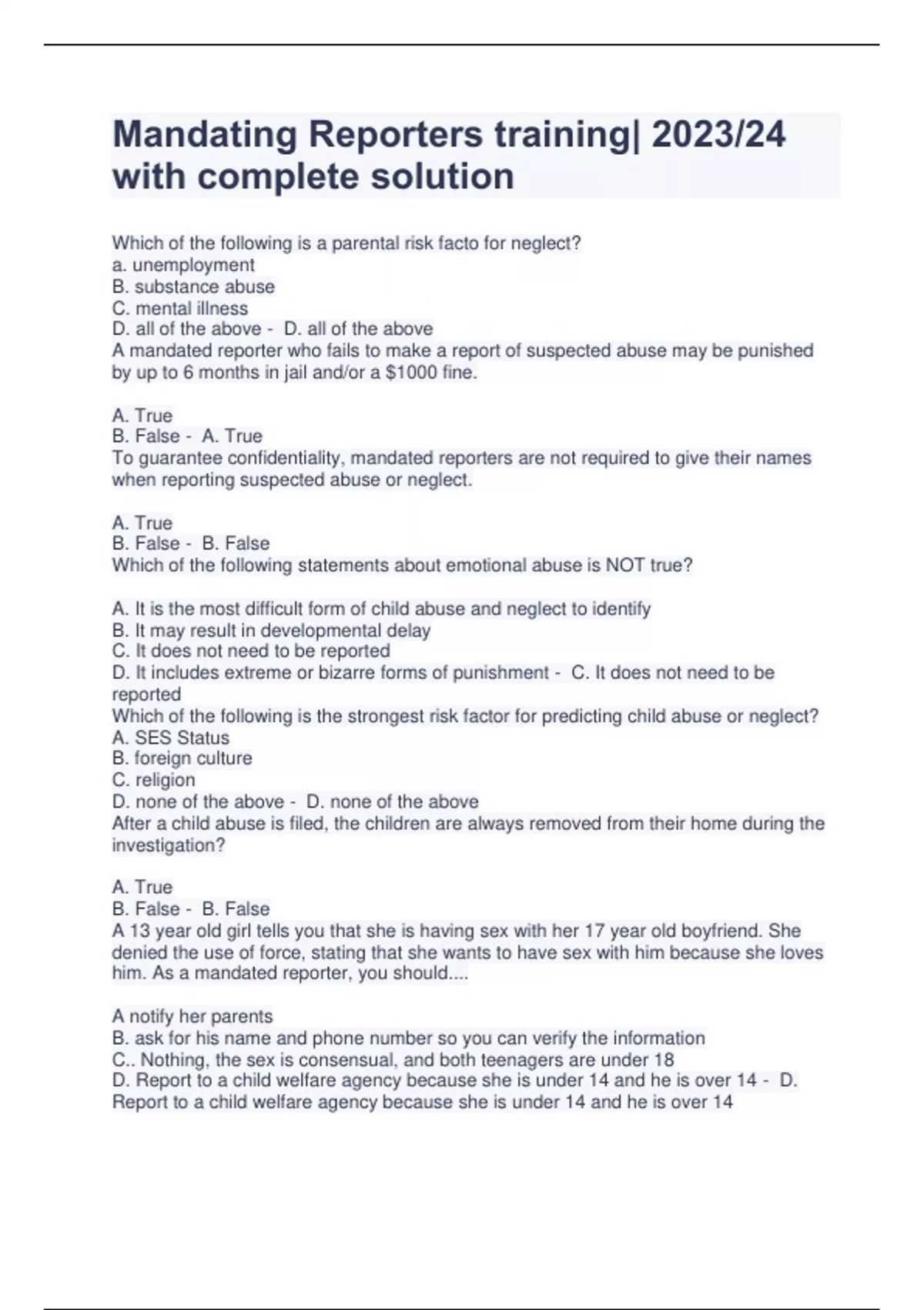 Mandating Reporters training| 2023/24 with complete solution,Mandated reporter worksheet,Child Abuse Mandated Reporter: Medical Professional Training Answers,Child Abuse Mandated Reporter: School Personnel Training/ Training Assessment,Mandated reporter training
