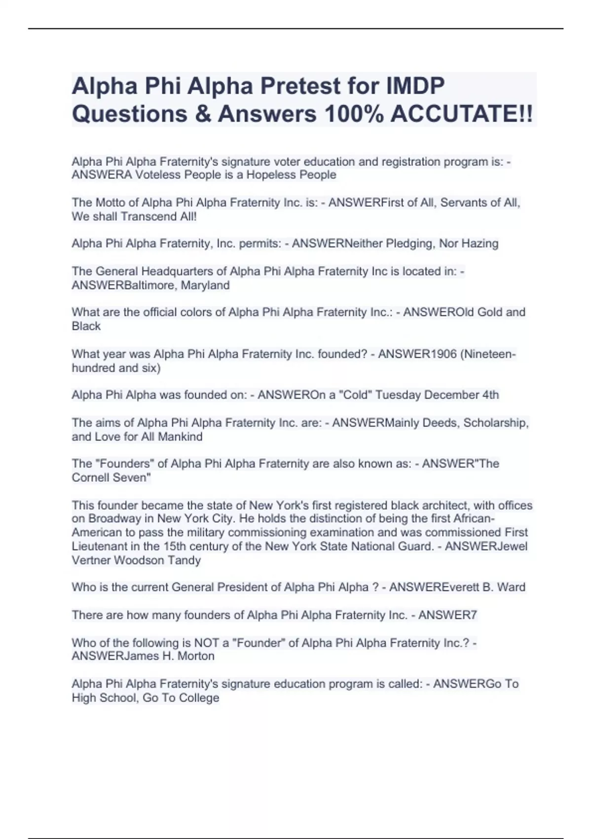 IMDP 2, History of Alpha Phi Alpha Fraternity Incorporated , Risk Management , IMDP Packet, Alpha Phi Alpha Pretest for IMDP Questions & Answers 100% ACCUTATE!!Alpha Phi Alpha Pretest for IMDP Questions & Answers 100% ACCUTATE!!Alpha Phi Alpha Pretest for IMDP Questions & Answers 100% ACCUTATE!!