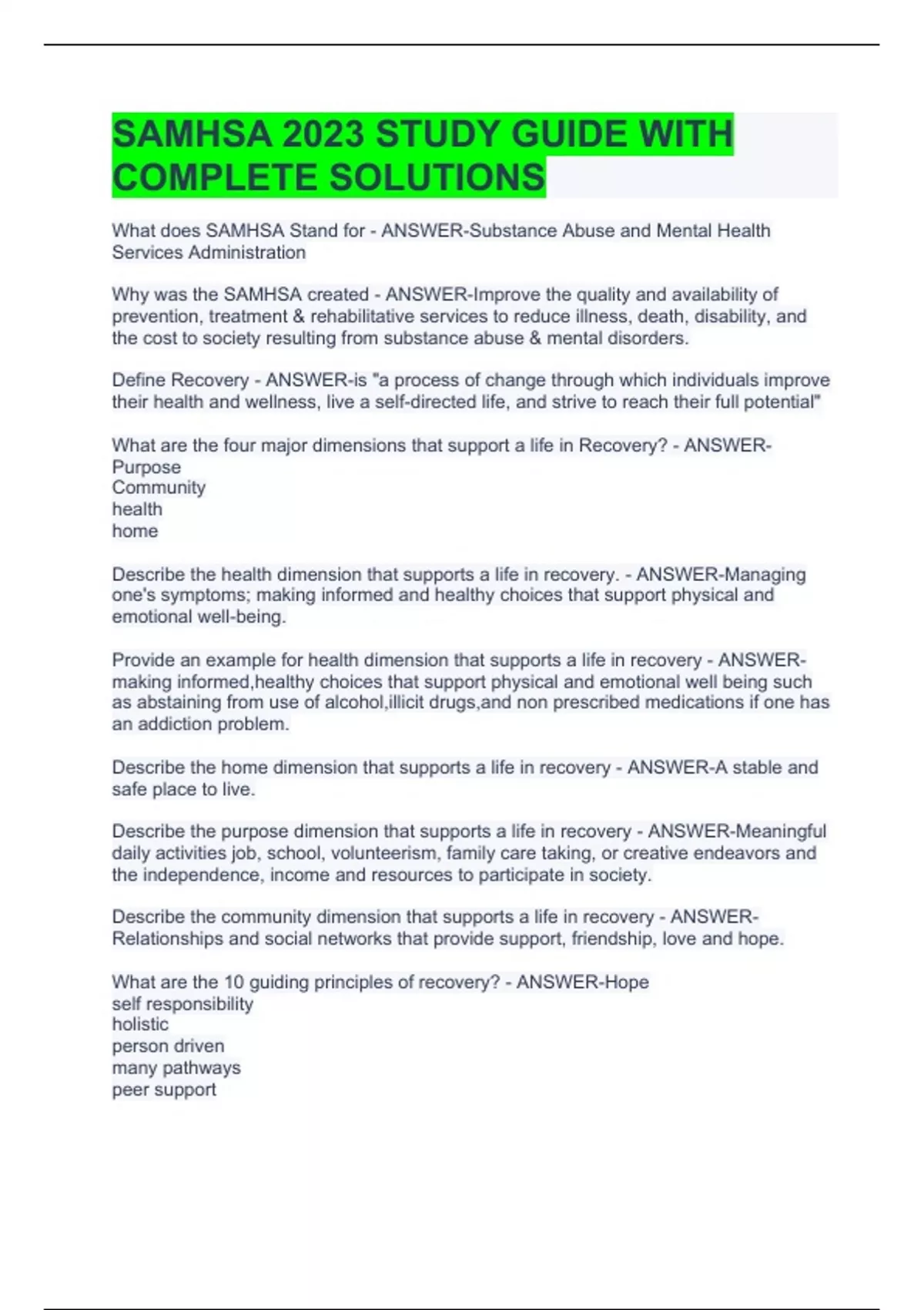 SAMHSA 2023 STUDY GUIDE WITH COMPLETE SOLUTION SAMHSA 2023-Substance abuse and mental health services administration Exam SAMHSA Exam 2023 CalMHSA Medi-Cal Peer Support Certification Exam 2023