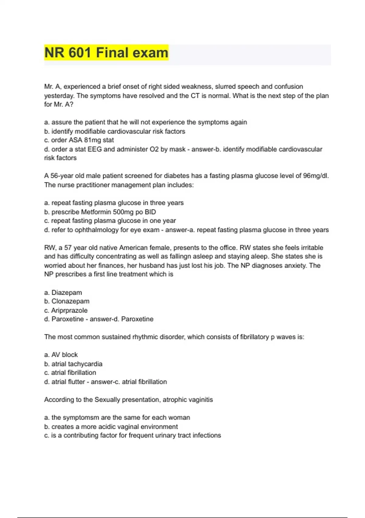 NR 601 2023 exam A+ graded 100% verified correct answers with full solution
